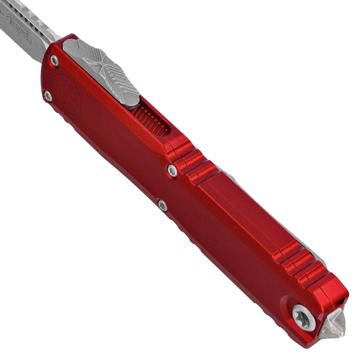 Ultratech Gen IV S/E Merlot Aluminum, Apocalyptic is a full-size OTF (Out The Front) automatic knife from Ultratech. The fourth generation is distinguished by a number of improvements such as; Crud Kutter™, Dual-Fuel Drive Train™. The Handle was also redesigned, equipping it with solutions known from other models. Working in D/A (Double Action) mode, it allows the blade to be instantly extended and retracted with a single thumb movement. The design by Tony Marfione, owner of Microtech Knives, combines modern design with the highest quality workmanship.