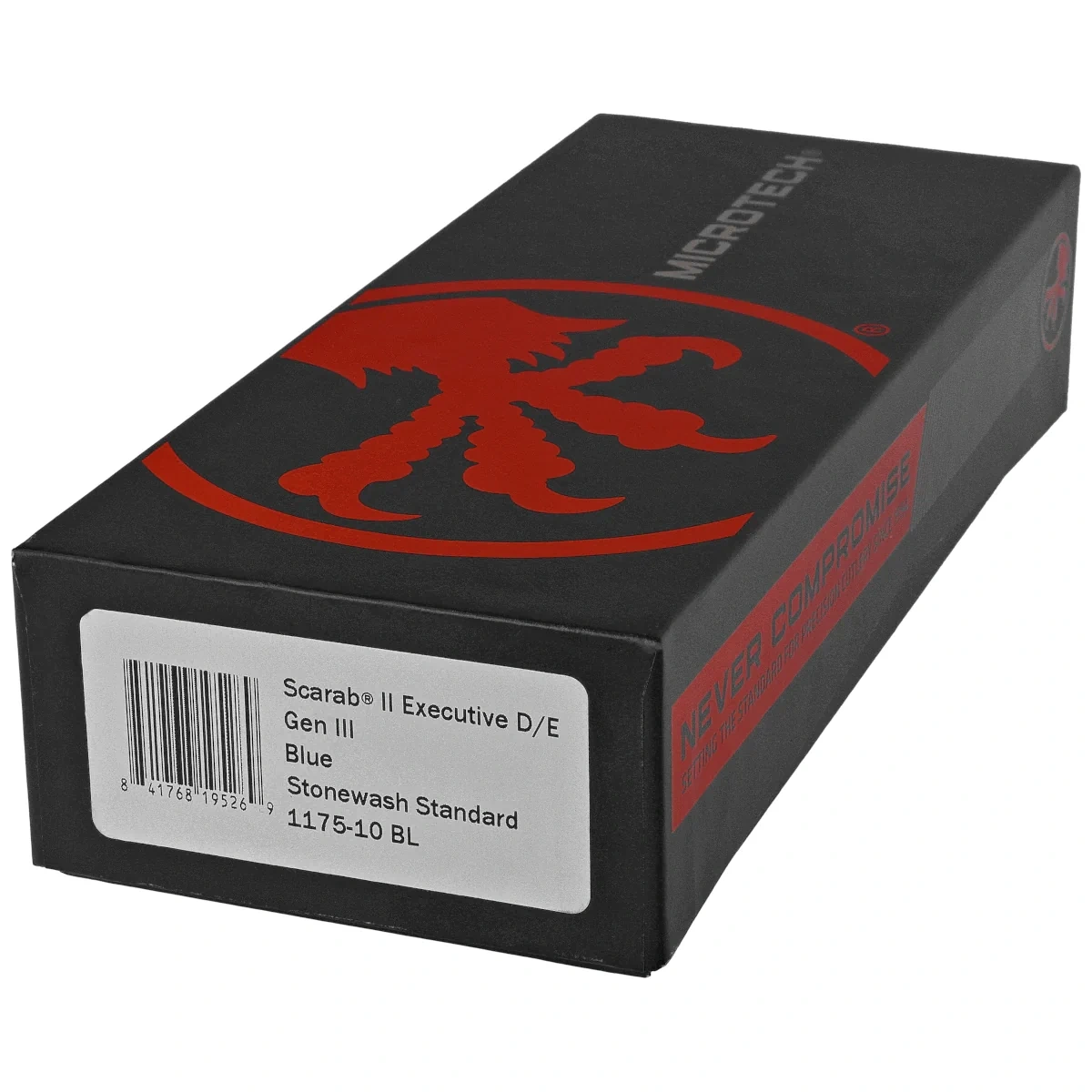 Microtech Scarab II Gen III Executive D/E OTF Knife Blue Aluminum, Stonewashed M390MK by Tony Marfione (1175-10BL)