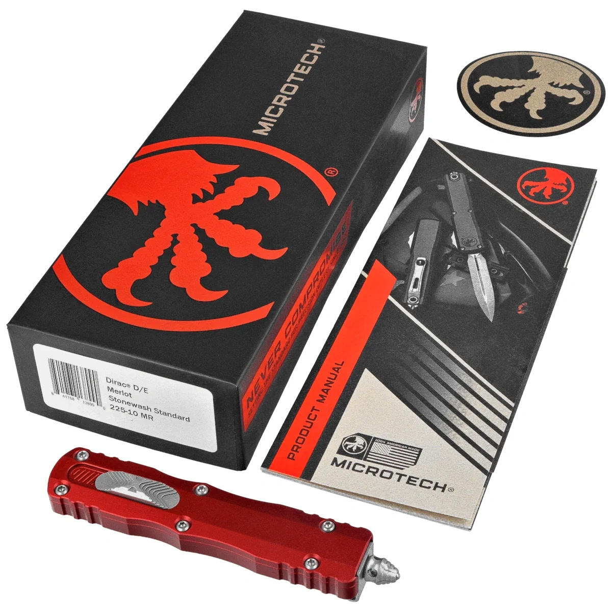 • Dirac D/E Merlot Aluminum, Stonewashed is a compact OTF automatic knife from the Dirac series. Operating in D/A mode, it features a hell of a fast blade extension mechanism. Slider button on the side of the handle. Designed by Tony Marfione of Microtech.