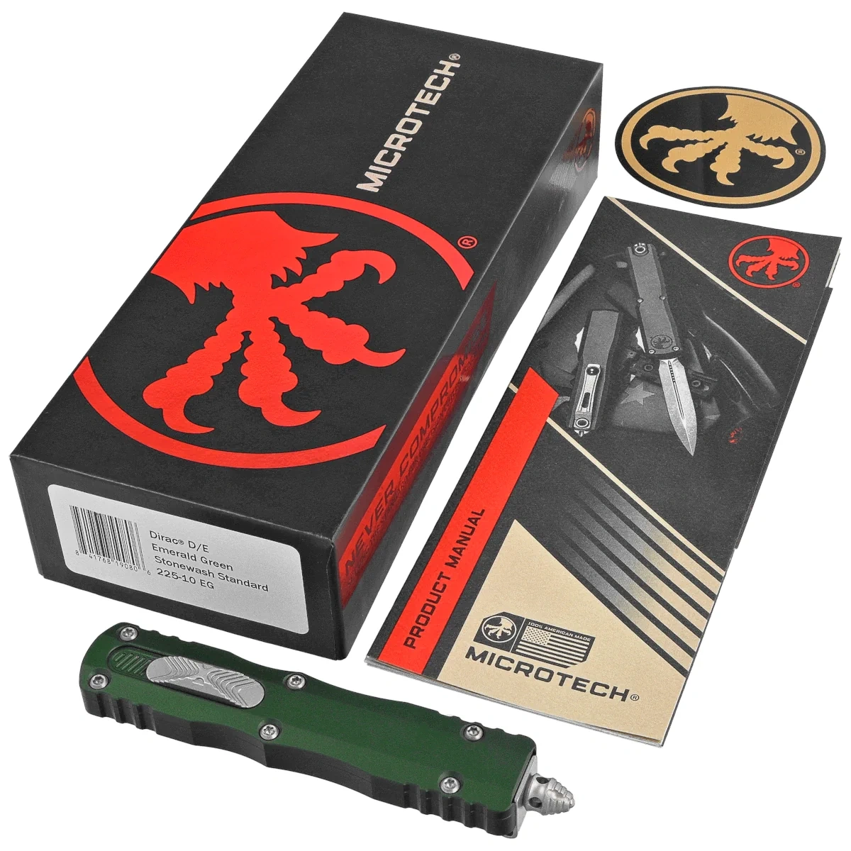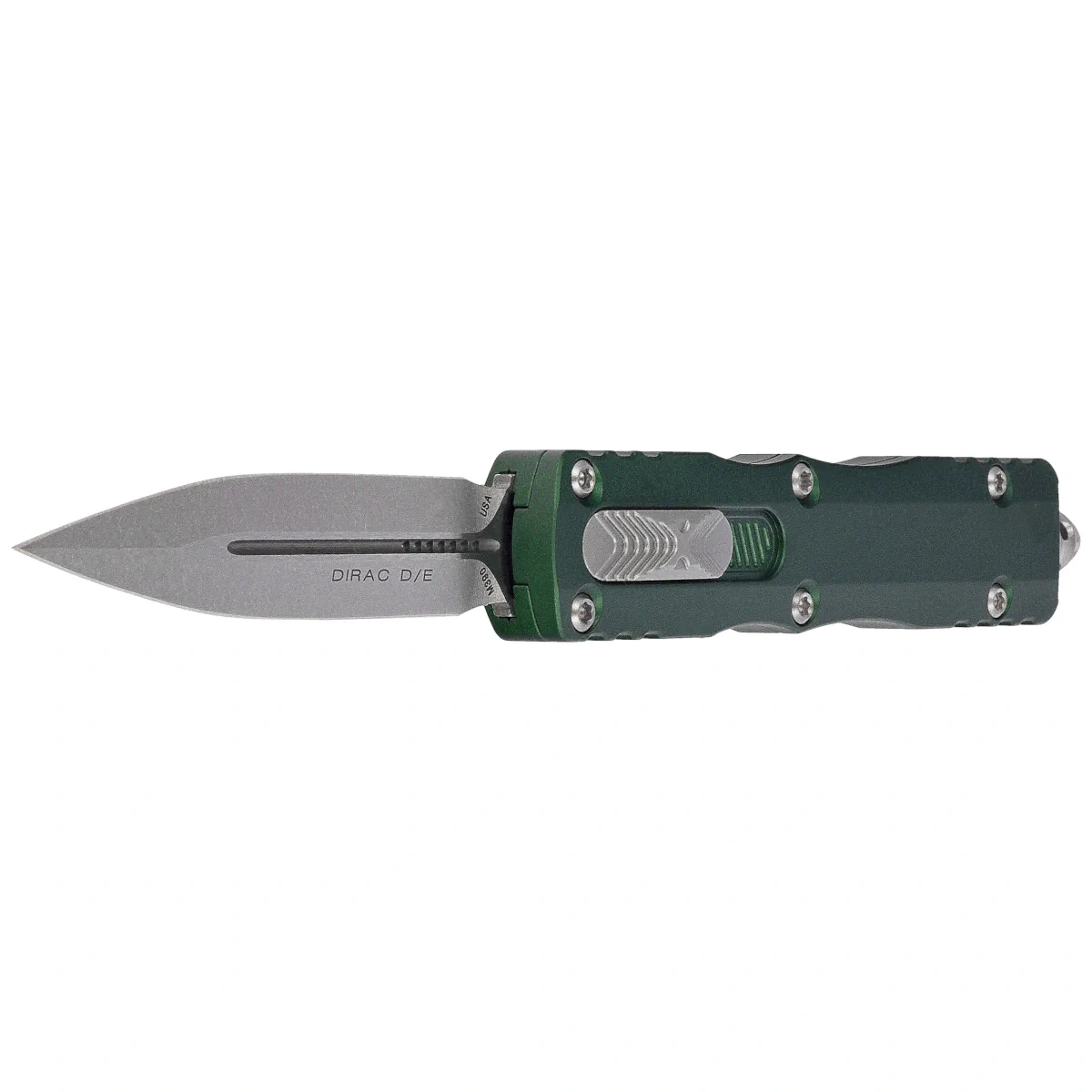 Dirac D/E Emerald Green Aluminum, Stonewashed is a compact OTF automatic knife from the Dirac series. Operating in D/A mode , it features a hell of a fast blade extension mechanism. Slider button on the side of the handle. 100% made and assembled in the USA. Designed by Anthony Marfione, knifemaker and owner of Microtech Knives.
