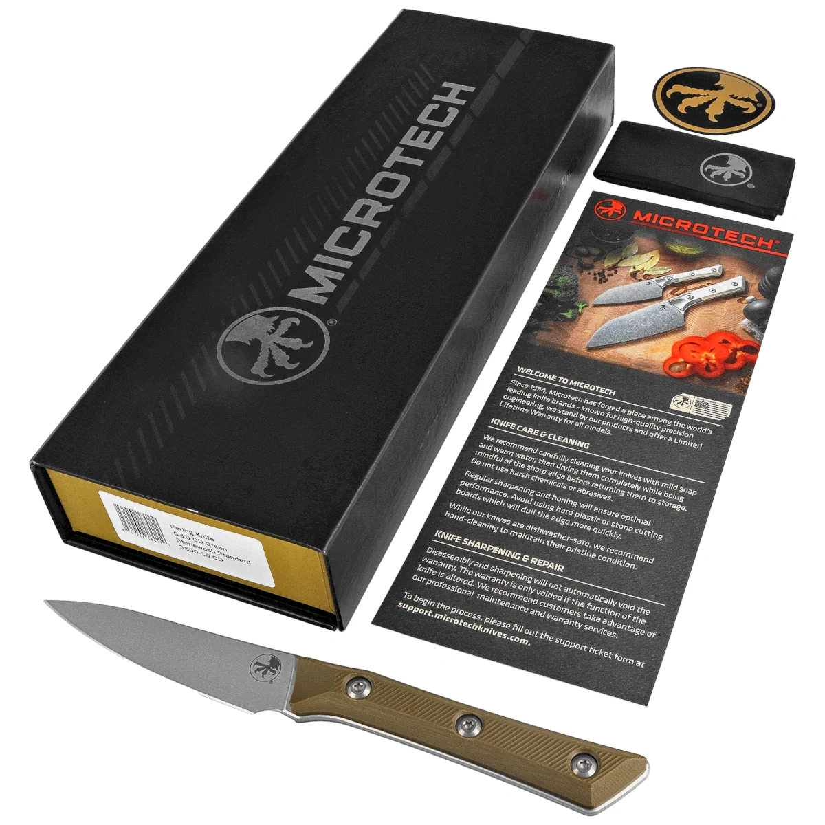 Pairing OD Green G10, Stonewashed is a modern interpretation of the traditional kitchen knife by one of America's most respected knife brands. Created in the spirit of technical perfection and utilitarian minimalism, it is the perfect tool for professional chefs and enthusiasts of precision cutting. The traditional silhouette is enhanced here with high-end materials and ergonomics refined to perfection. Blade made of advanced M390MK steel offers excellent sharpness retention, full corrosion resistance and microstructure stability, even under heavy use. Its stonewashed finish gives the surface a matte texture that effectively masks traces of use and adds a professional, working character to the blade . The pairing profile makes the knife successfully perform the tasks of peeling, cleaning or shaping, while maintaining smooth operation and precise blade guidance. The handle is made of durable G10 composite, a material resistant to moisture, temperature and mechanical factors. Subtle milling improves the grip, and the minimalist geometry of the handle provides stable support for the hand - regardless of the intensity of work. Mounting elements in the form of torx screws increase the rigidity of the design and allow easy disassembly for maintenance. Thanks to the perfectly balanced combination of ergonomics, durability and modern design, the Pairing model from Microtech is perfect both in the professional kitchen and in the hands of the home user who does not consider compromising on quality. The included protective blade sheath allows for safe storage and transportation. This is a knife that not only meets expectations - he redefines them.