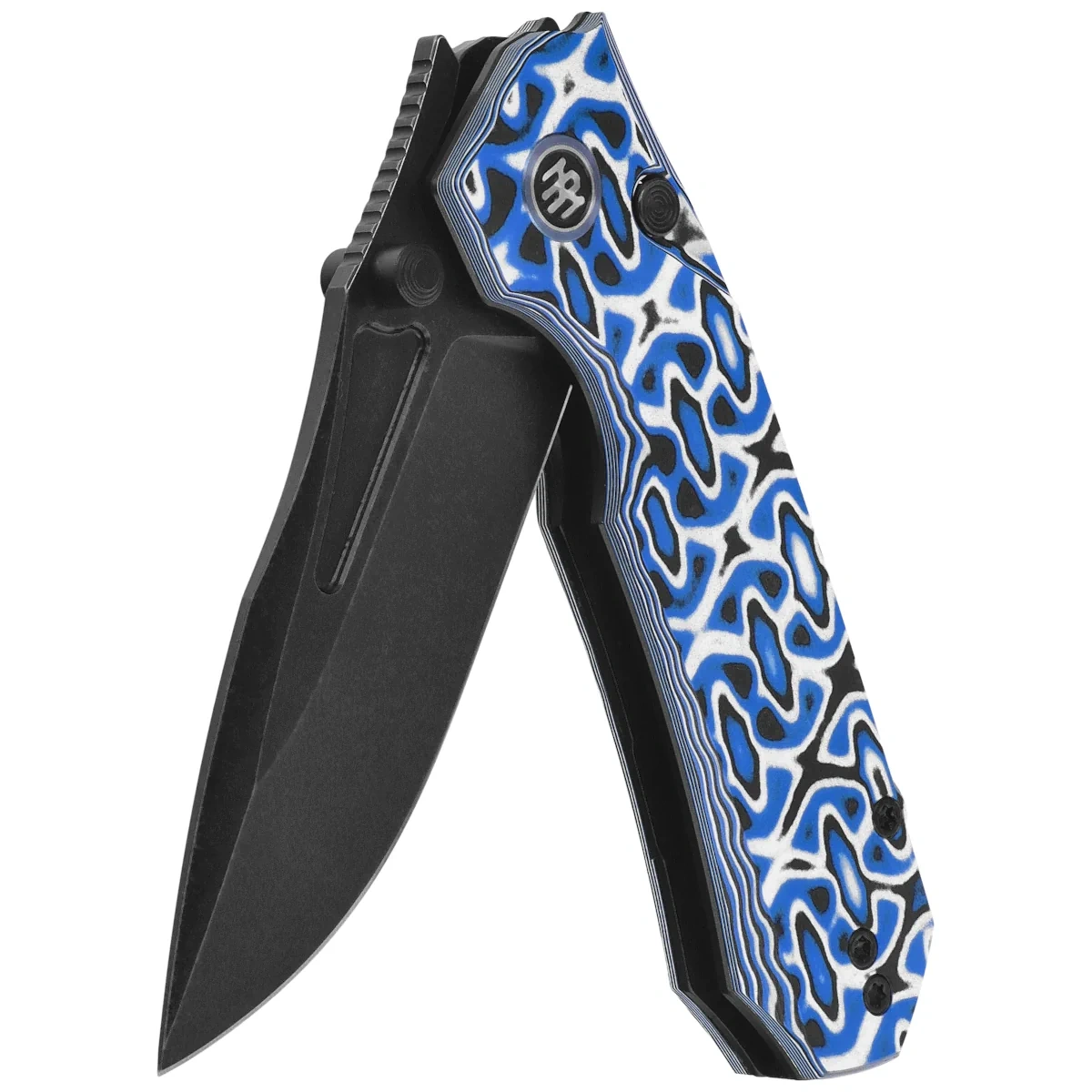 • RT-Rhino Blue/White G10, Black Stonewashed handy compact EDC folding knife. Blade drop point made of D2 tool steel, fast Front Flipper blade for opening and G10 handle. Excellent value for money! Bestseller!