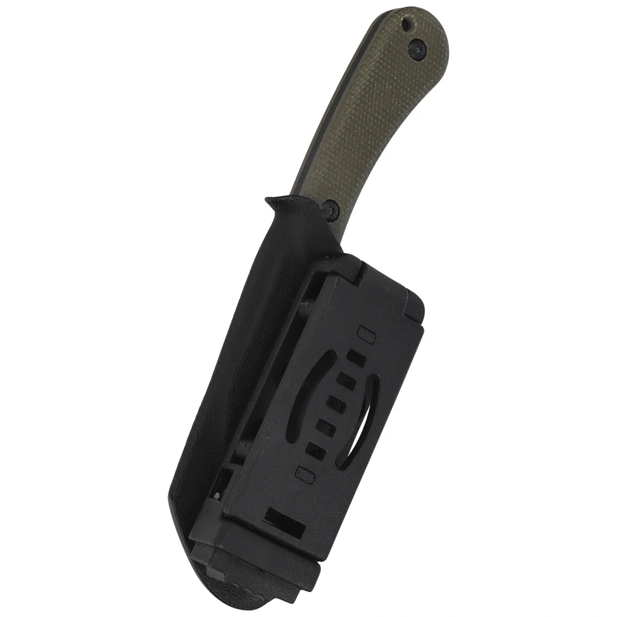 Handle - made of Micarta composite, a material valued for its durability, moisture resistance, and secure grip. The delicate texture improves hand grip, which works particularly well when working in more challenging conditions or with a damp grip. The grip profile maintains a slim, ergonomic shape with slightly rounded edges, ensuring the knife fits comfortably in the hand despite its compact size. The full tang construction running the entire length of the handle increases the knife’s overall rigidity and instills a sense of solidity. The knife is complemented by steel screws and a lanyard hole, enhancing its practicality for EDC and outdoor use. Another key component of the set is the Kydex sheath with a Tek-Lok attachment, which allows for convenient carrying on a belt, gear, or backpack, emphasizing the mobile nature of this model.