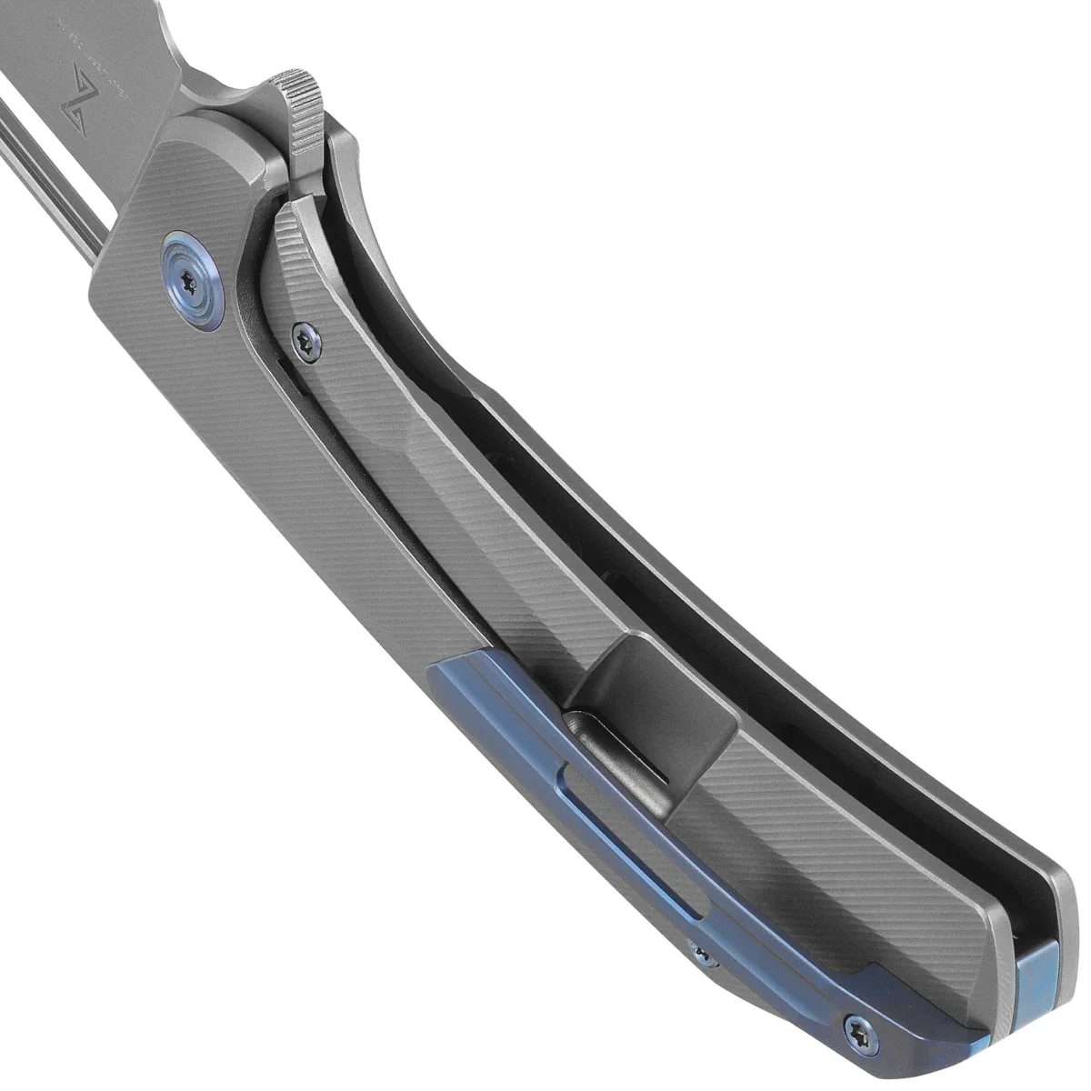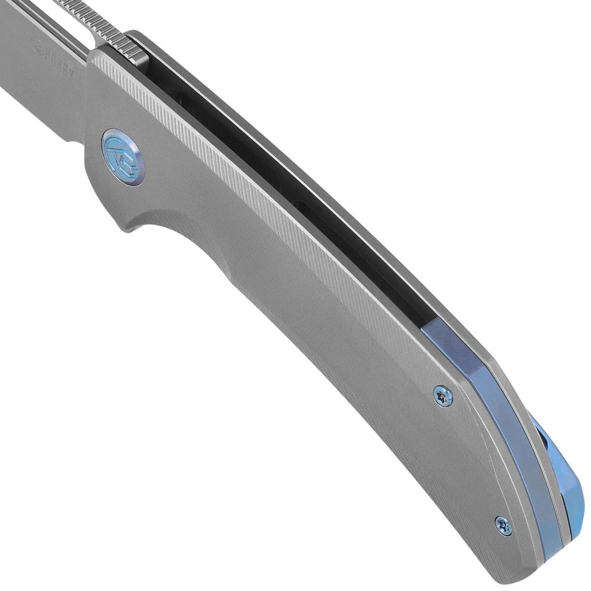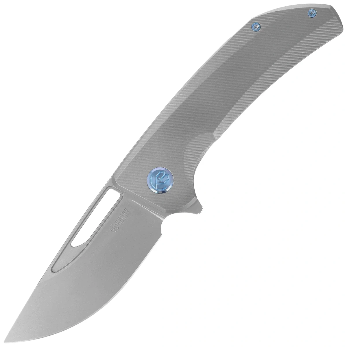 Handle - consists of two pieces of solid 6AL4V titanium; frilled lines on the surface improve grip and add aesthetic appeal. The beveled edges of the covers eliminate sharp edges for comfort and improve grip security. A solid titanium backspacer, to which the grips are attached, ensures the rigidity and durability of the entire construction. The simple, robust design guarantees years of reliable use. A deep forefinger groove improves grip security. The pivot is adorned with a stylized Kubey Knife logo. A single-position (right-side) titanium deep carry clip allows you to carry the knife discreetly in your pocket in a tip-up position (blade tip facing up).