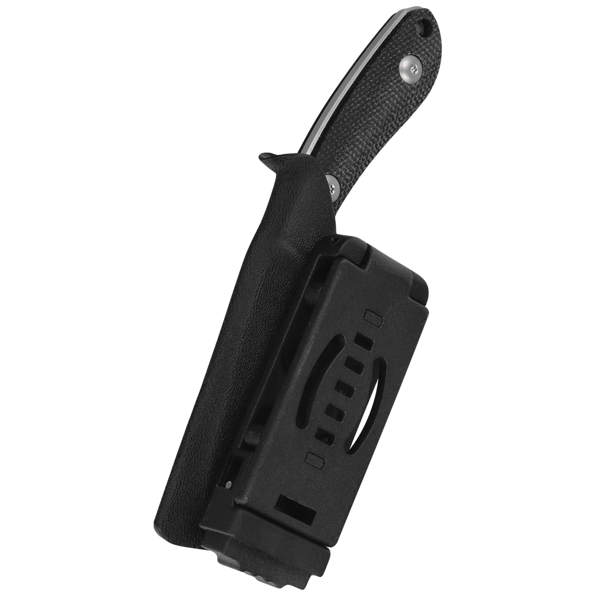 Handle - made of Micarta composite, a material valued for its durability, moisture resistance, and secure grip. The delicate texture improves hand grip, which works particularly well when working in more challenging conditions or with a damp grip. The grip profile maintains a slim, ergonomic shape with slightly rounded edges, ensuring the knife fits comfortably in the hand despite its compact size. The full tang construction running the entire length of the handle increases the rigidity of the entire knife and creates a sense of solidity. The knife is complemented by steel screws and a lanyard hole, enhancing its practicality for EDC and outdoor use. Another key component of the set is the Kydex sheath with a Tek-Lok attachment, which allows for convenient carrying on a belt, gear, or backpack, emphasizing the mobile nature of this model.