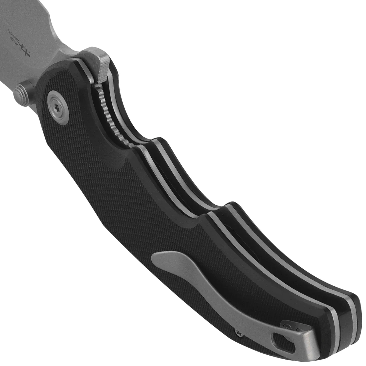 Handle - made of G10 composite, it was designed with a focus on ergonomics and a secure grip. Its distinctly contoured, slightly curved shape fits the hand very well and improves the stability of the knife’s handling, both with a classic working grip and during more precise blade manipulation. The G10 composite offers high resistance to moisture, mechanical damage, and temperature changes, making it an excellent choice for a knife intended for everyday carry and light outdoor work. The subtle surface texture improves grip without excessive wear on the pocket. The steel tip-up, right clip allows for comfortable and discreet pocket carry, ensuring quick access to the knife. The entire design is clearly focused on functionality—it’s a secure, comfortable, and well-balanced handle that perfectly complements the Ceto model’s utility-oriented character.