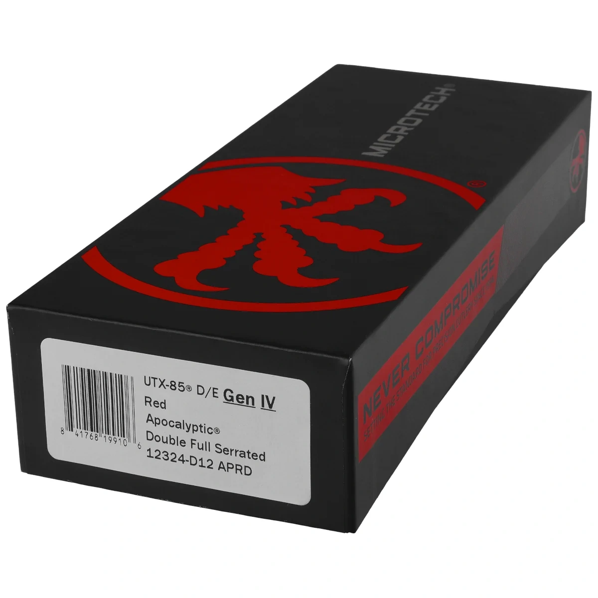 - UTX-85 Gen IV D/E Red Aluminum, Apocalyptic F/S is a compact OTF automatic knife from the UTX-85 series. Designed for EDC applications, it retains all the advantages of larger models. Operating in D/A mode, it features a fast blade extension mechanism.