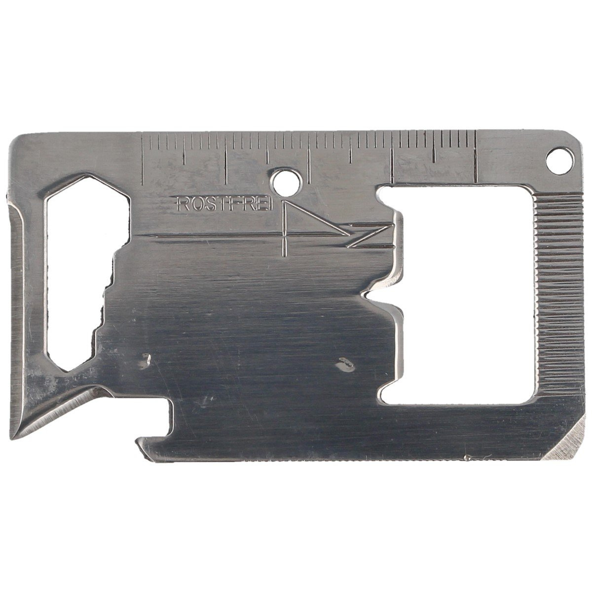 • 14-in1 Survival-Tool (karta przetrwania-survivalowa) kompaktowe narzędzie o rozmiarach karty kredytowej niemieckiej firmy Herbertz Solingen. Niewielkie rozmiary wykonanej ze stali nierdzewnej karty umożliwiają przenoszenie w portfelu lub w kieszeni..