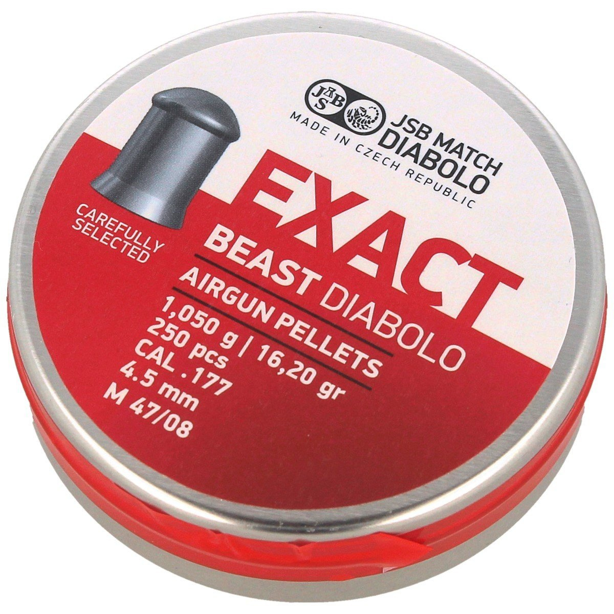 - Diabolo Exact Beast nadkalibrowy 4,52 mm, to najcięższy ze śrutów JSB. Uważany za numer 1 przez posiadaczy najmocniejszych wiatrówek (FAC) oraz przez strzelców ceniących dużą moc i stabilność strzałów w każdych warunkach pogodowych.