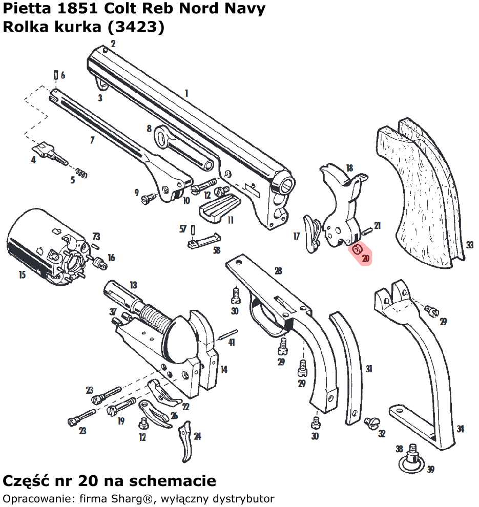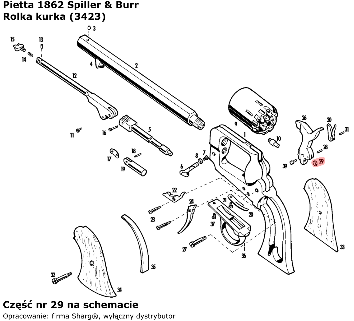 3423 (serwis) rolka kurka do rewolweru czarnoprochowego 1858 Remington New Model Army (.44 cal) / Navy (.36 cal) firmy Pietta. Pasuje również do modeli: 1862 Spiller & Burr, 1873 Single Action Steel, 1851 Colt Reb Nord Navy, 1860 Army oraz 1861 Navy