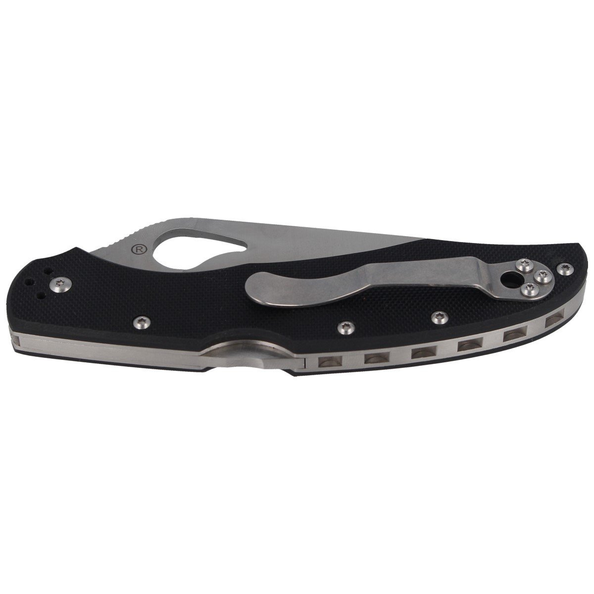 Głownia - typu Drop Point zapewnia doskonałą geometrię krawędzi tnącej o niskim współczynniku tarcia (Low-Friction). Karbowany fragment grzbietu głowni, rampa (jimping) ustawia kciuk oraz daje solidne podparcie, a łukowate podcięcie pod palec wskazujący między rękojeścią a krawędzią tnącą (finger choil jimping) ułatwia operowanie folderem. Wycięcie w kształcie komety Comet-shaped (patent Spyderco) do płynnego otwarcia klingi. Blokada głowni Back-Lock z zabezpieczeniem przed przypadkowym zwolnieniem blokady podczas mocnego chwytu, wycięcie w blokadzie projektu Davida Boye'a.