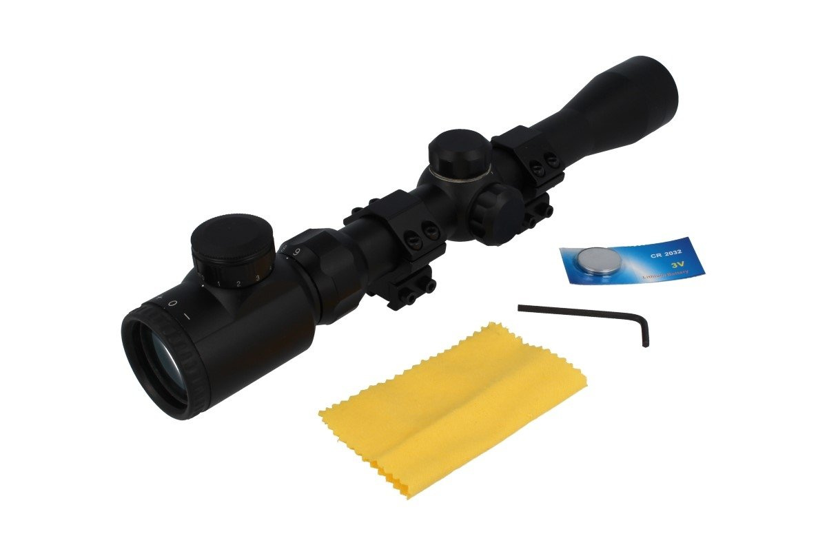 • 19309, celownik optyczny Lensolux. Najlepszy stosunek ceny / jakość! Zmienne powiększenie 3-9x, średnica obiektywu 32 mm, podświetlany krzyż 4 Red-Dot. Odporny na energię odrzutu generowaną podczas strzału. Do strzelania sportowego i do mocnych wiatrówek.