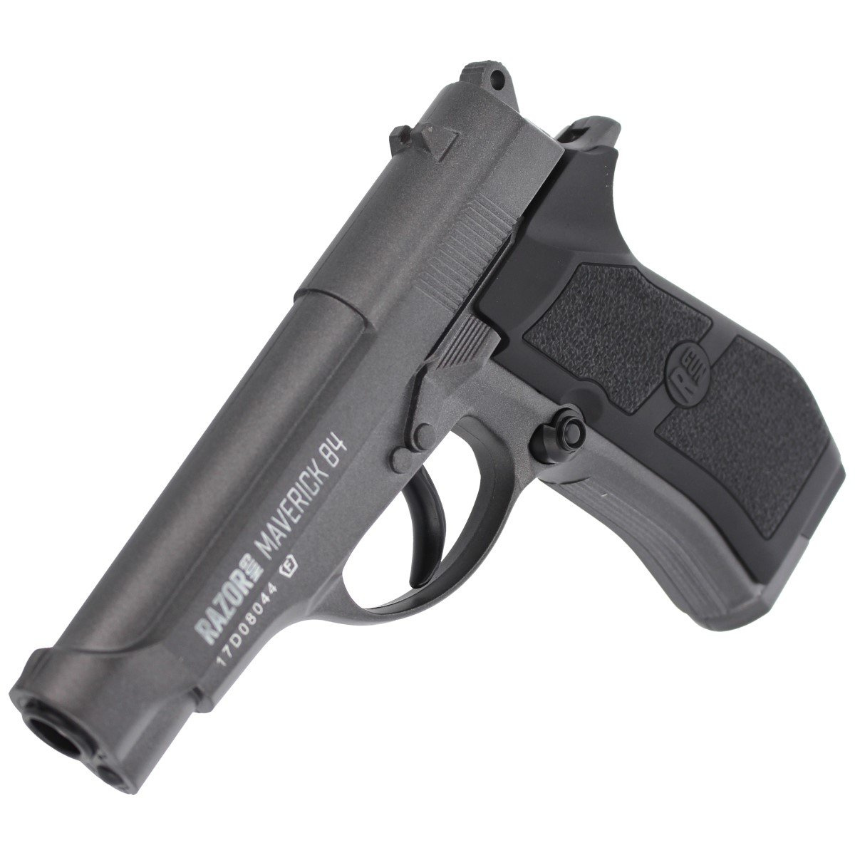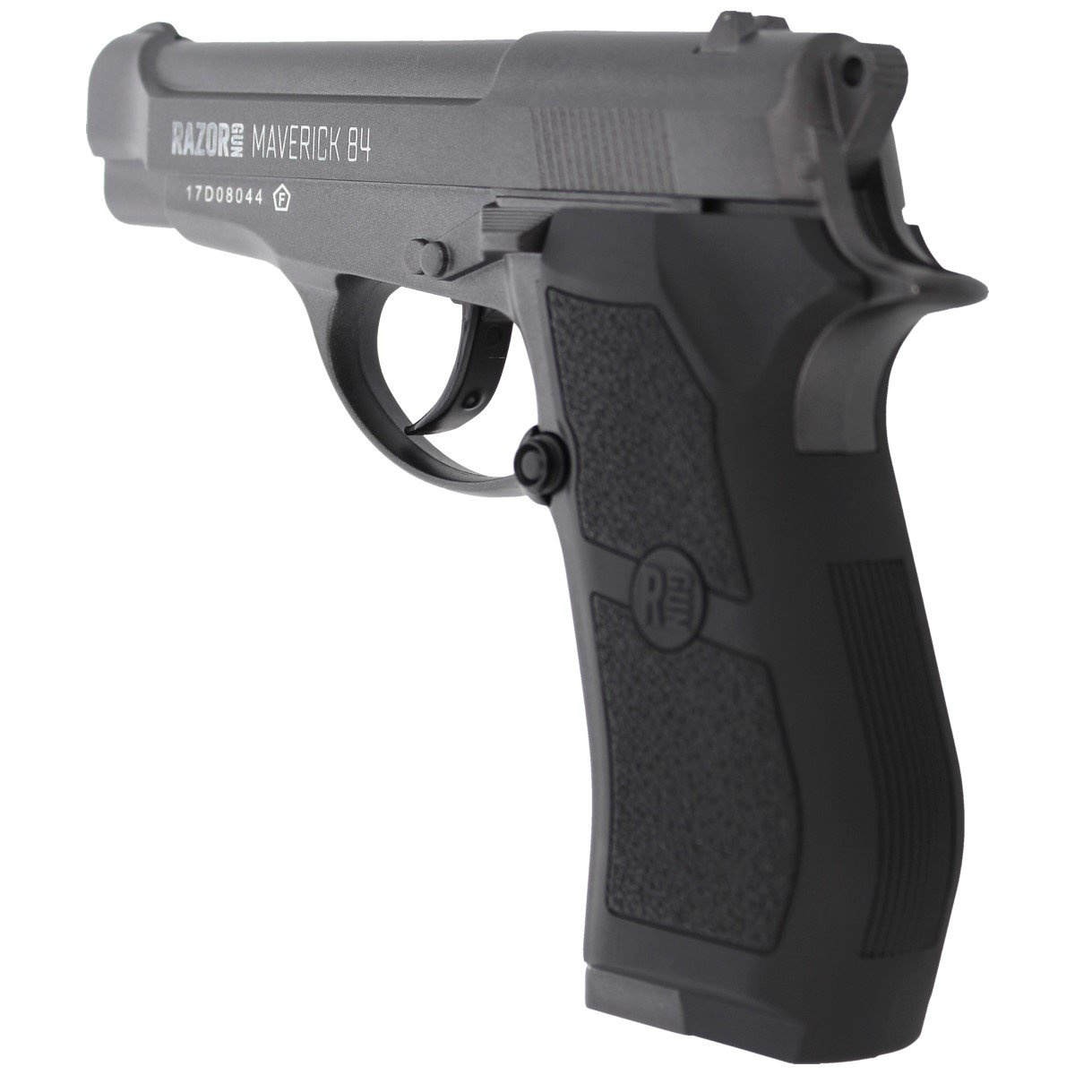 337-005 wzorowany na popularnej broni palnej - Beretta M84 9mm - pistolet pneumatyczny Maverick 84 marki RazorGun. Wykonany z metalu (full metal) szkielet oddaje realną wagę prawdziwej broni. Pistolet wyposażono w metalowe stałe przyrządy celownicze.