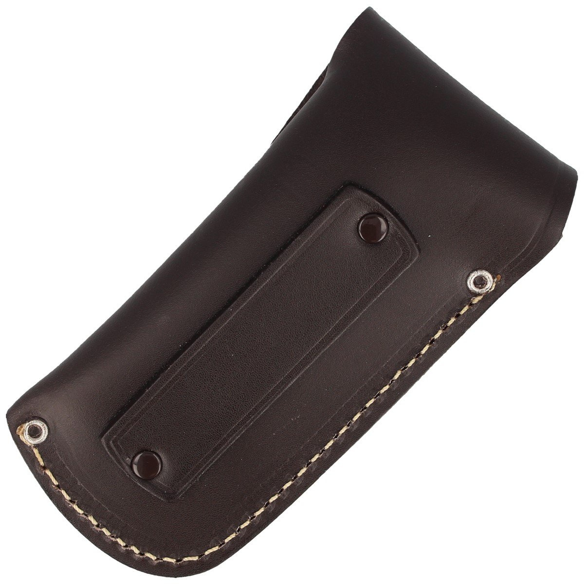 Solidny, wykonany z naturalnej skóry wołowej w kolorze ciemnobrązowym pokrowiec z tłoczonym logo producenta. Pochwę przeszyto na brzegach ozdobną nicią. Mocowanie do pasa lub oporządzenia umożliwia przenoszenie noża w pozycji pionowej.