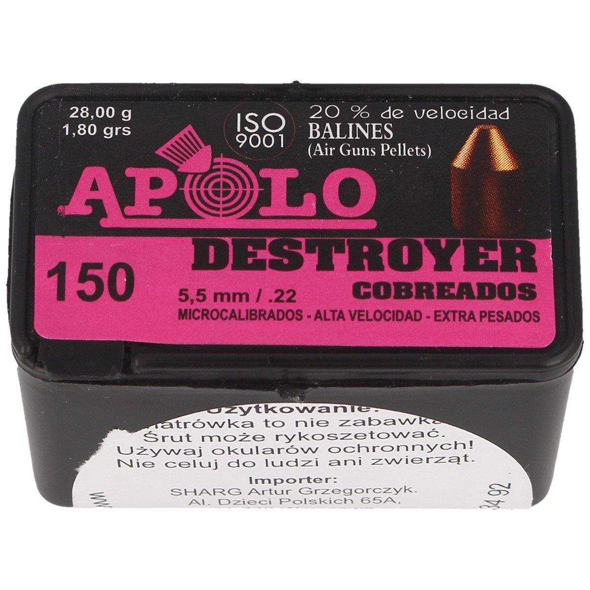 - Destroyer Copper .22 ciężki, selekcjonowany śrut Premium firmy Apolo. Polerowany i utwardzany miedzianą powłoką umożliwiającą uzyskanie o 20% wyższych prędkości oraz lepszej celności śrucin. Do najmocniejszych wiatrówek w kal. 5.5 mm. Opak. 150 szt.