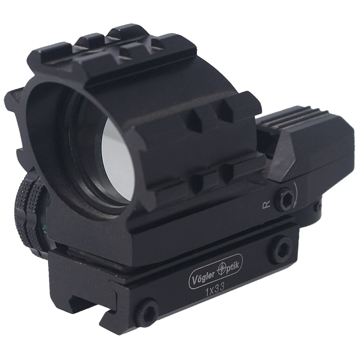 VO-1x33, celownik kolimatorowy marki Vögler Optik z montażem, płynną regulacją natężenia, podświetleniem w dwóch kolorach czerwonym i zielonym oraz czterema rodzajami siatek. Rozmiar plamki 2 MOA, powiększenie 1x, soczewka 33 mm. Przeznaczony do mocowania na broni krótkiej, strzelbach gładkolufowych, broni kombinowanej oraz na wiatrówkach pneumatycznych.