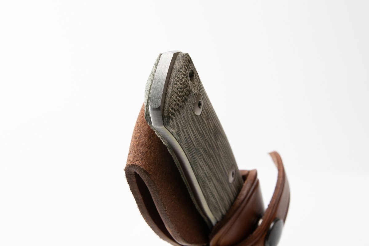 Rękojeść - wykonana z odpornej na uszkodzenia Micarty Green Canvas. Frezowane okładziny z antypoślizgową teksturą zapewniają doskonały uchwyt. Wyrafinowana ergonomia rękojeści umożliwia trzymanie noża w obie strony kciukiem w kierunku ostrza lub w kierunku końca rękojeści. Płaski trzpień z lanyard hole, otworem na linkę, pomocny do rozpalania ognia za pomocą krzesiwa, może też pełnić funkcję młotka.