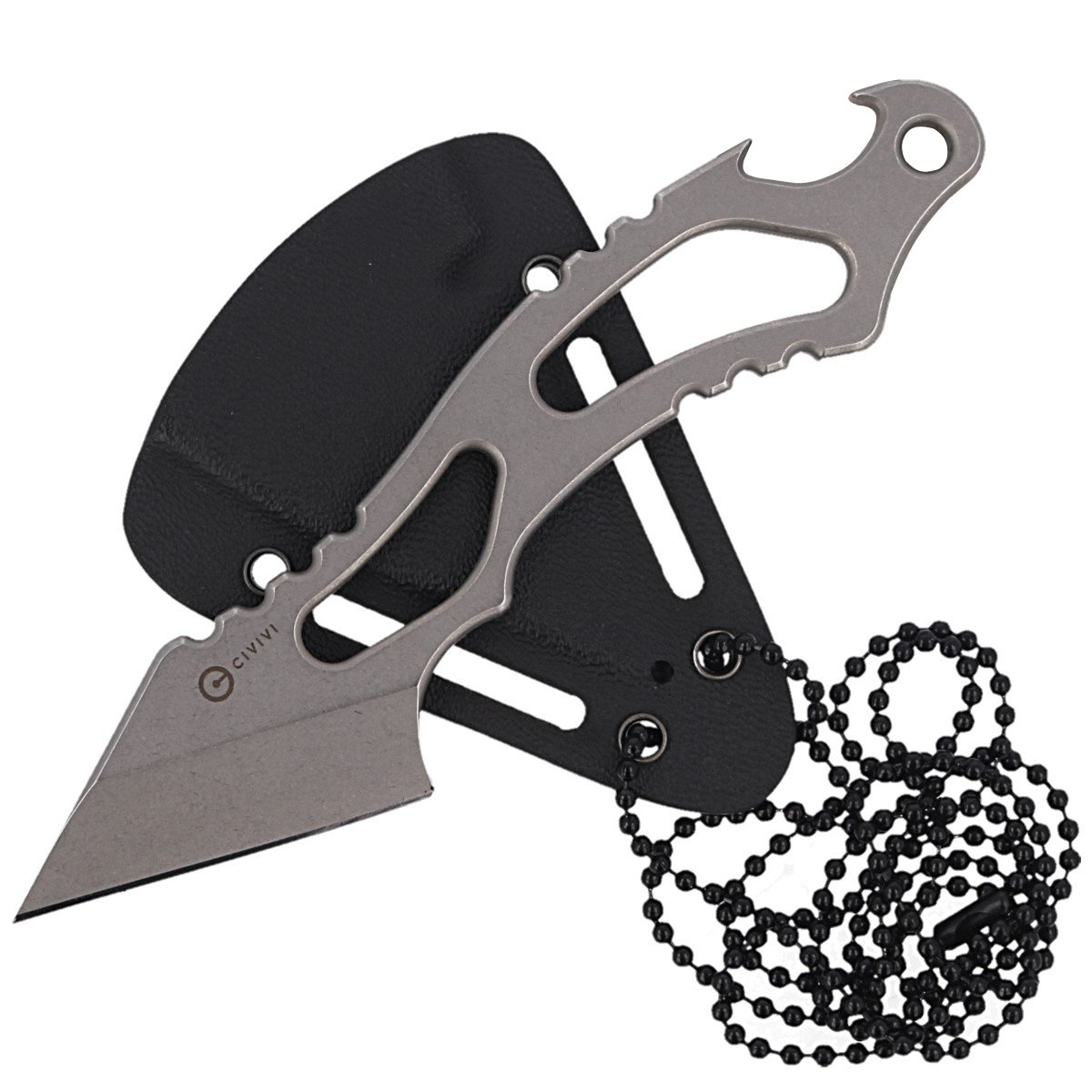 Noże EDC mają rękojeść typu szkieletowego, posiadającą w tylnej części otwieracz do butelek. W komplecie dostajemy czarną pochwę z kydexu którą dzięki dołączonemu czarnemu łańcuszkowi możemy nosić na szyi.