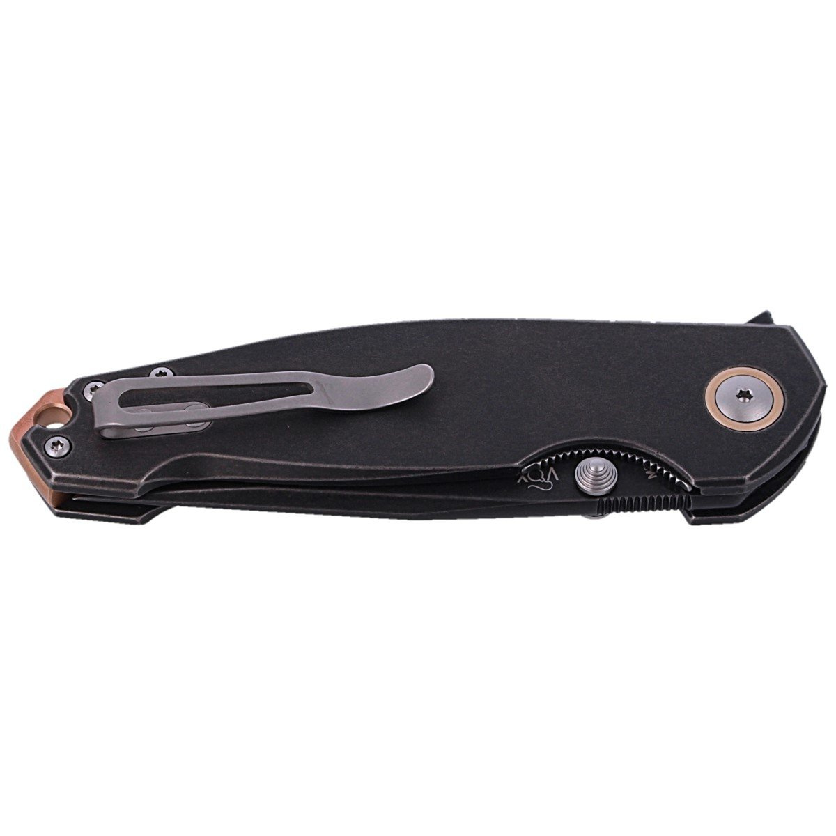 Rękojeść - okładziny z tytanu wykończone metodą Stonewashed, a następnie pokryte czarną powłokąpołączone ze sobą przy pomocy frezowanego obrabiarkami CNC backspacera, dzięki czemu nóż zachowuje pożądaną sztywność konstrukcji. Backspacer oraz ozdobny pierścień wokół pivota tzw. pivot collar wykonano z brązu fosforowego (phosphor bronze). Wykonane z przodu podcięcie na palce (fore finger groove) poprawia pewność uchwytu, tworząc jednocześnie z flipperem gardę zapobiegającą ześlizgnięciu się dłoni na ostrze. Prawostronny, jednopozycyjny tytanowy klips deep carry, pozwala przenosić dyskretnie nóż w pozycji tip-up (czubkiem do góry). Na końcu rękojeści lanyard hole, otwór na linkę.