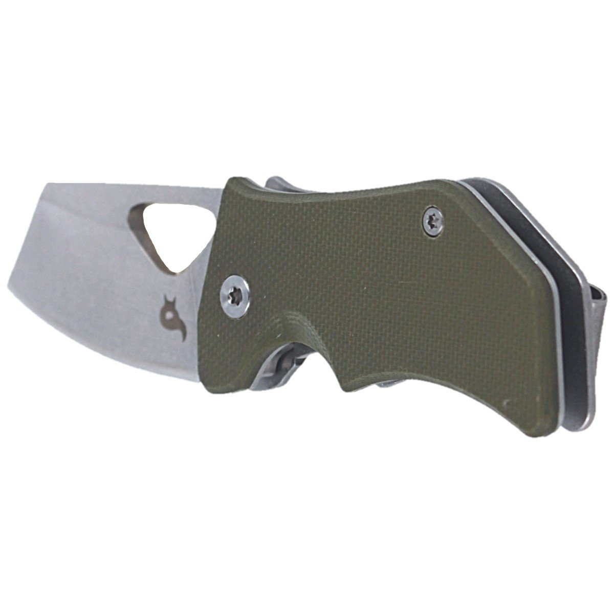 Rękojeść to z jednej strony zielone G10 przykręcone do stalowego linersa, z drugiej gruby kawąłek nierdzewnej stali. Okładziny zostały ze sobą skręcone przy pomocy tulei dystansowych dzięki czemu zmniejszono ciężar i zachowano otwartą konstrukcję. Klips typu deep carry, jednopozycyjny, umożliwia przenoszenie noża w pozycji tip-up.