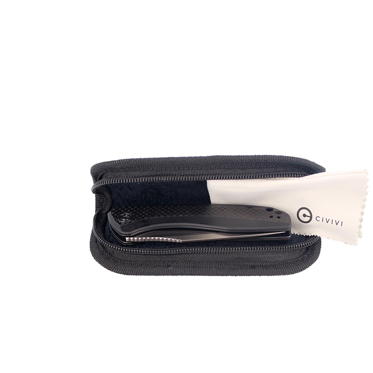 Rękojeść - połączenie sfazowanego czarnego G10, laminowanego włóknem węglowym. Gładka powierzchnia okładzin, ale z wyczuwalną teksturą poprawiającą pewność uchwytu. Całość mocowana do linersów ze stali nierdzewnej. Prosta, solidna konstrukcja daje pewność wieloletniego użytkowania bez osłabienia konstrukcjiBackspacer z czarnego tworzywa G10Oś pivota zdobi stylizowane logo marki Civivi. Dwupozycyjny lewo / prawostronny metalowy klips deep carry pozwala przenosić dyskretnie nóż w kieszeni w pozycji tip-up (czubkiem ostrza do góry). Lanyard hole, otwór na linkę.