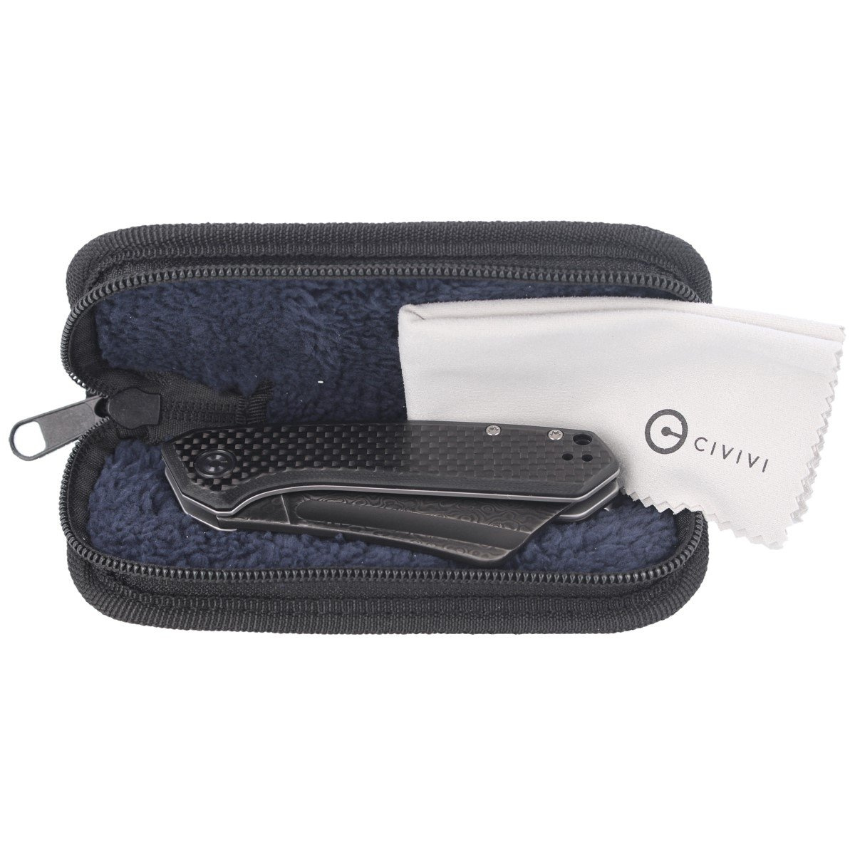 Rękojeść warstwa litego G10, laminowana Carbon Fiber (włóknem węglowym) o diagonalnym wzorze Twill. Gładka powierzchnia okładek, ale z wyczuwalną teksturą poprawiającą pewność uchwytu. Całość zamocowano do stalowych linersów, co w praktyce oznacza wiele lat użytkowania. Backspacer z czarnego tworzywa G10.  pivota zdobi stylizowane logo marki Civivi. Dwupozycyjny lewo / prawostronny metalowy klips deep carry pozwala przenosić dyskretnie nóż w kieszeni w pozycji tip-up (czubkiem ostrza do góry). Nad klipsem lanyard hole, otwór na linkę.