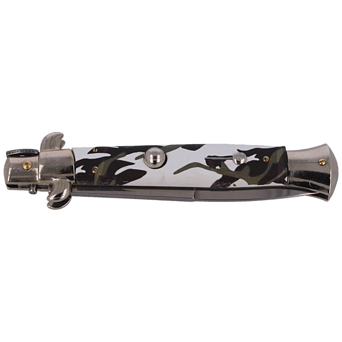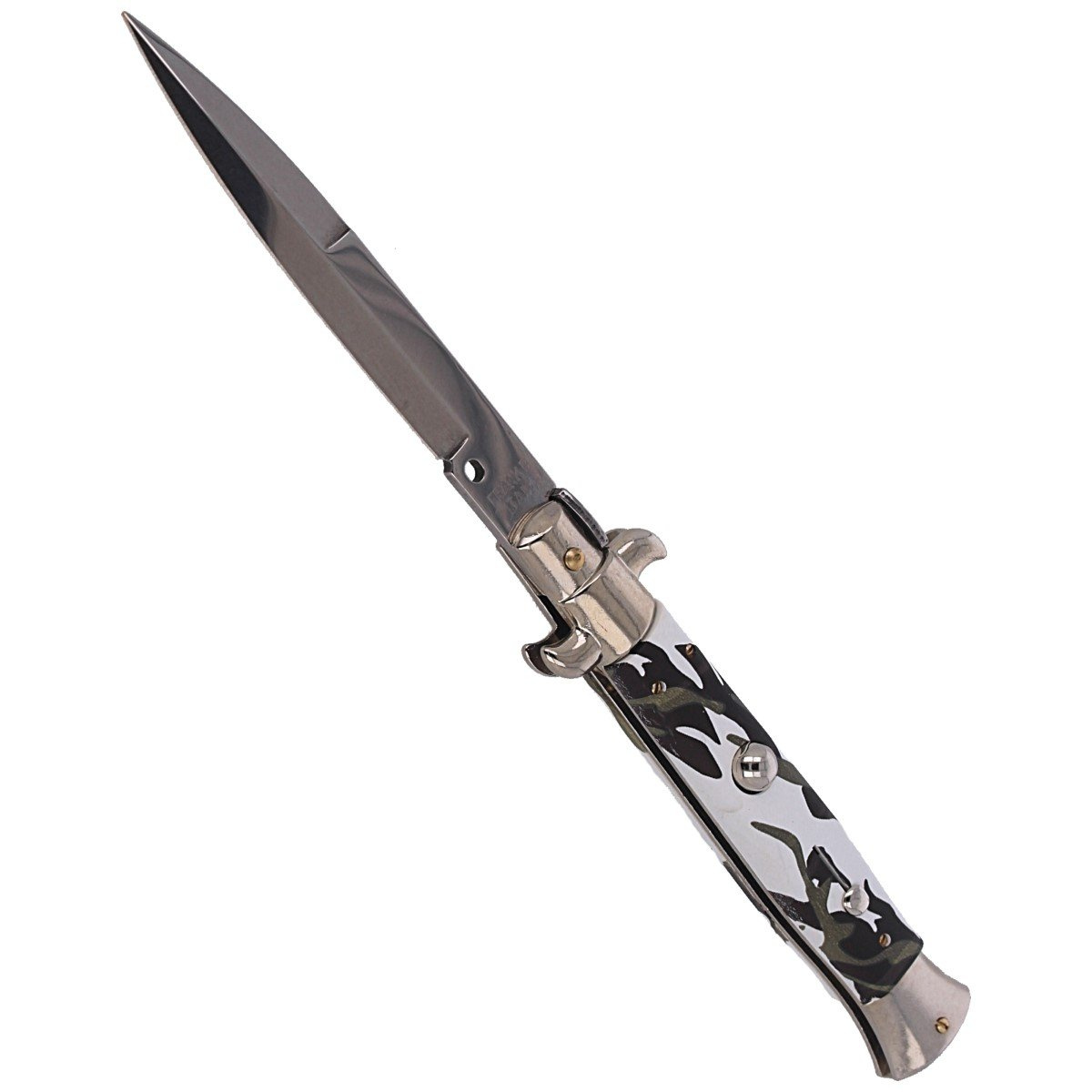Switch Italian Bayonet w/Serigraphy 23cm, tradycyjny włoski nóż sprężynowy z rękojeścią, z tworzywa w czarno-białym kamuflażuOtwarcie klingi musi odbyć w ciągu kilku setnych sekundy (cecha noży Stiletto). Całkowicie ręcznie wykonane, zgodnie z zasadami włoskiego rzemiosła, noże z legendarnej manufaktury Frank Beltrame stały się sławne na całym świecie dzięki swej skrajnej lekkości i wytrzymałości. Dzięki swoim właściwościom, włoski sztylet jest odpowiedni do zastosowania w każdym środowisku. Solidna, wytrzymała konstrukcja oraz mocna otwierająca głownię sprężyna, to cechy wyróżniające klasyczne noże sprężynowe Frank Beltrame.