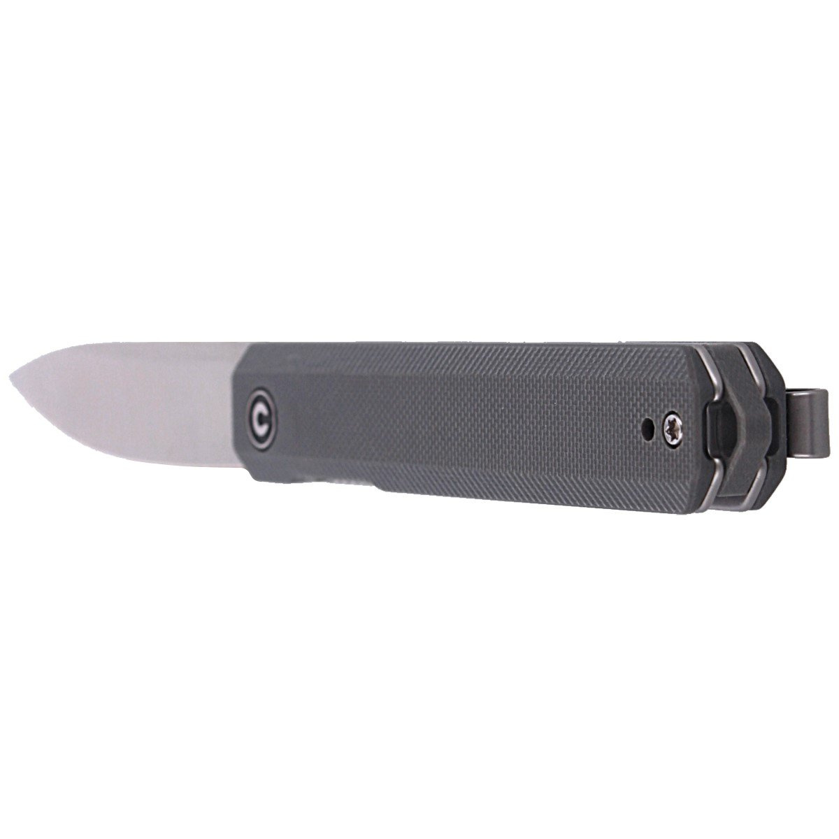 Rękojeść - fazowane okładziny z szarego tworzywa G10, mocowane do linersów ze stali nierdzewnej. Powierzchnia okładek z wyczuwalną teksturą poprawiającą pewność uchwytu. Prosta, solidna konstrukcja daje pewność wieloletniego użytkowania. Backspacer wykonano z tego samego materiału co okładziny rękojeści. Oś pivota zdobi stylizowane logo marki Civivi. Metalowy dwupozycyjny głęboki lewo / prawostronny klips deep carry pozwala przenosić dyskretnie nóż w kieszeni w pozycji tip-up (czubkiem ostrza do góry). W tylnej części backspacera otwór na linkę, lanyard hole.