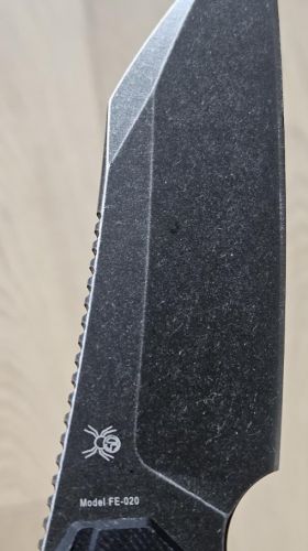 Głownia - grubości 3 mm o profilu Wharncliffe, zapewnia doskonałą geometrię krawędzi tnącej przy niskim oporze. Klinga wykonana z dobrze trzymającej ostrość stali nierdzewnej 8Cr13MoV (odpowiednik japońskiej stali AUS-8). Ostrze gładkie typu Plain wyprowadzono szlifem płaskim (Flat Grind) zapewniającym doskonałe właściwości tnące oraz redukcję wagi. Eliminująca odblaski powłoka Black Stonewash. Karbowane podparcie: rampa pod kciuk (spine jimping) oraz finger choil, podcięcie pod palec wskazujący pomiędzy klingą a rękojeścią.