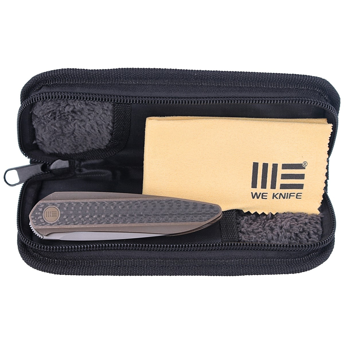 Rękojeść - wykonana z dwóch kawałków tytanu, dla poprawienia chwytu uzupełnionego wkładką z czarnego Carbon Fiber, frezowanego obrabiarkami CNC 3D. Zapewnia to niewiarygodną wytrzymałość, wymaga jednak najwyższych umiejętności i precyzji w produkcji. Oś pivota zdobi stylizowane logo marki WE. Prawostronny, jednopozycyjny tytanowy klips deep carry pozwala przenosić dyskretnie w kieszeni nóż w pozycji tip-up (ostrzem do góry).
