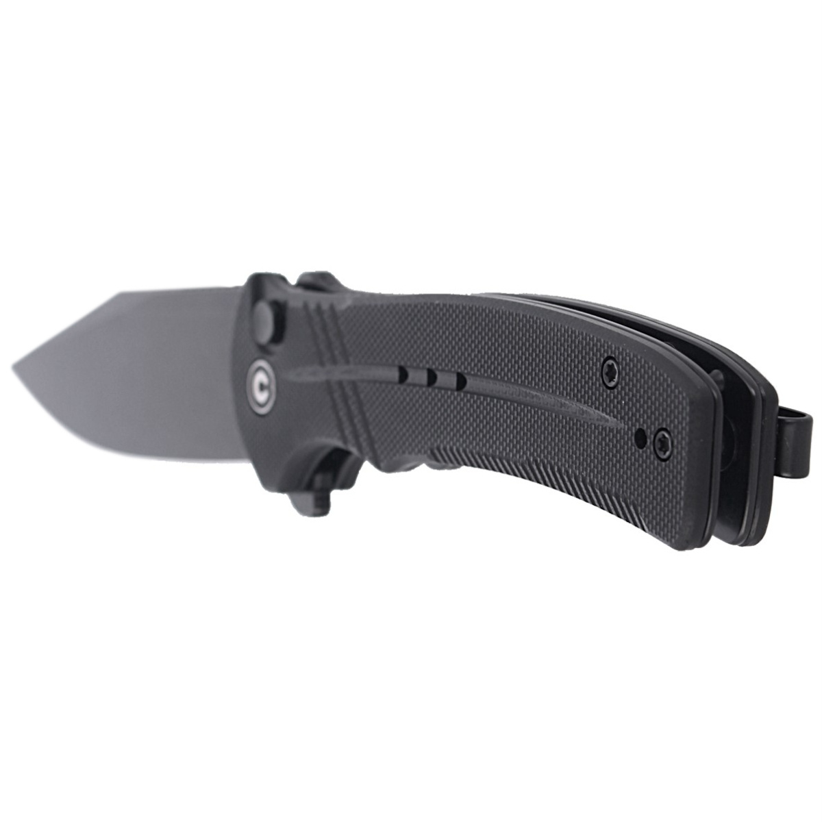 Rękojeść - w kolorze czarnym. Wykonana z tworzywa G10, włókna szklanego prasowanego pod ciśnieniem z żywicą. Fazowane krawędzie okładek eliminują ostre krawędzie dla wygody, a wykonany z przodu i z tyłu na linersach jimping poprawia pewność uchwytu. Otwarta konstrukcja tzw. open-backed mocowana stalowymi tulejami dystansowymi redukuję wagę oraz ułatwia czyszczenie. Oś pivota zdobi stylizowane logo marki Civivi. Dwupozycyjny, prawo/lewostronny klips deep carry pozwala przenosić dyskretnie nóż w kieszeni w pozycji tip-up (czubkiem ostrza do góry).