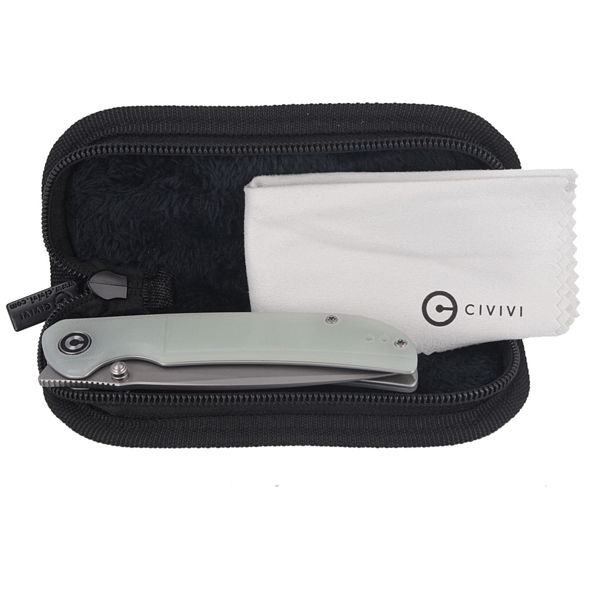 Rękojeść - w jasnym kolorze (natural) wykonana z tworzywa G10, włókna szklanego prasowanego pod ciśnieniem z żywicą. Fazowane krawędzie okładek eliminują ostre krawędzie dla wygody, a wykonany z przodu na linersach jimping poprawia pewność uchwytu. Pokryte imitacją bolstera oraz antypoślizgową teksturą dla lepszego uchwytu i wyglądu. Backspacer wykonany z tego samego materiału co okładziny. Oś pivota zdobi stylizowane logo marki Civivi. Dwupozycyjny, prawo/lewostronny klips deep carry pozwala przenosić dyskretnie nóż w kieszeni w pozycji tip-up (czubkiem ostrza do góry). W tylnej części backspacera miejsce do montażu linki zabezpieczającej lub ozdobnej.