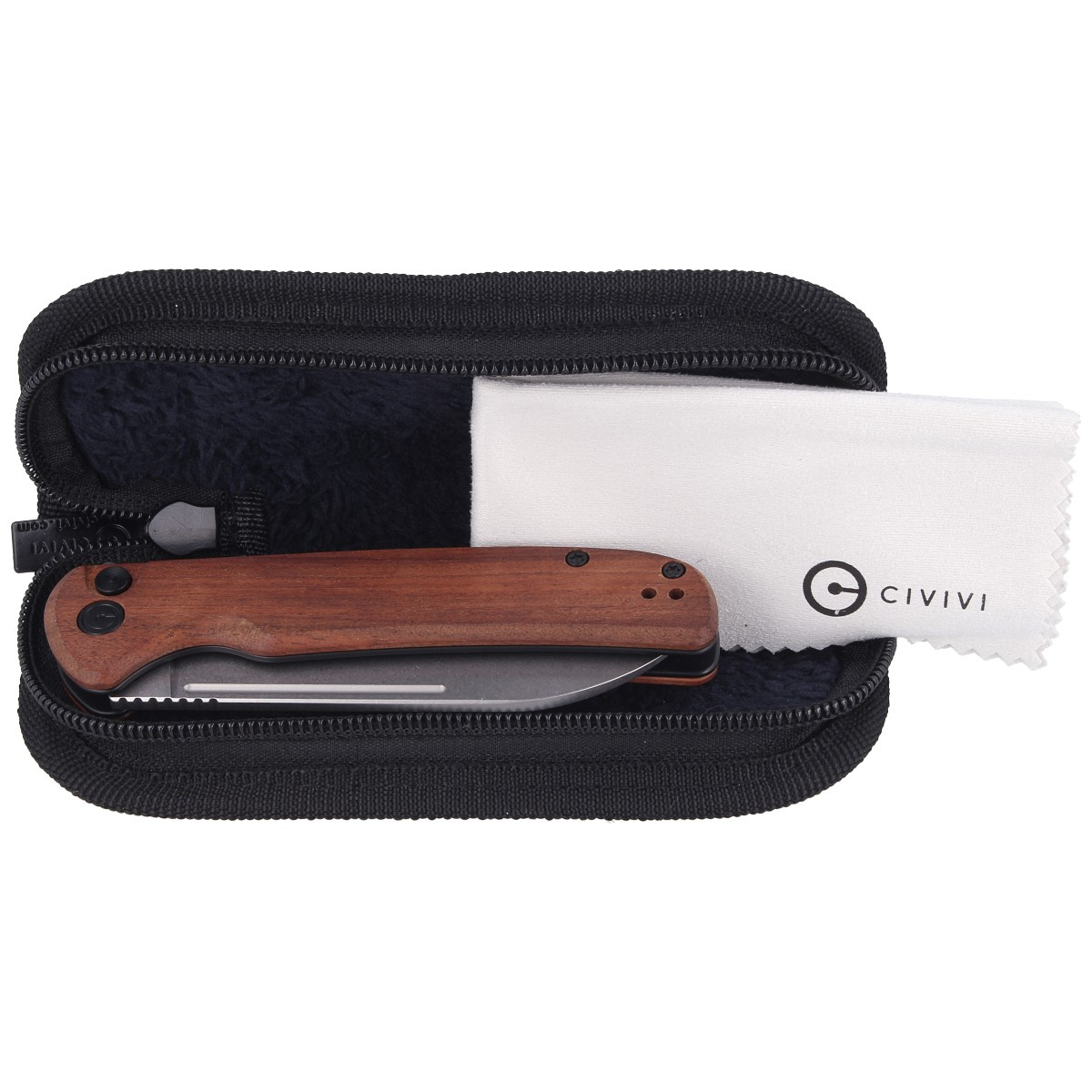 Okładziny z drewna egzotycznego Cuibourtia. Otwarta konstrukcja tzw. open-backed mocowana do siebie stalowymi tulejami dystansowymi zmniejsza wagę oraz ułatwia czyszczenie. Prosta, solidna konstrukcja daje pewność wieloletniego użytkowania. Oś pivota zdobi stylizowane logo marki Civivi. Metalowy obustronny klips deep carry pozwala przenosić dyskretnie nóż w kieszeni w pozycji tip-up (czubkiem ostrza do góry).