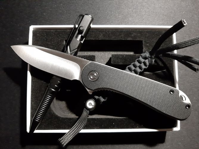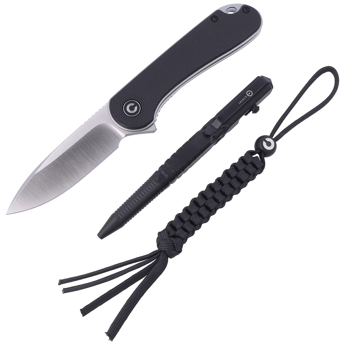 - Doskonały zestaw EDC w skład którego wchodzi nóż Civivi Elementum Flipper Black G10 Satin Finish, długopis Civivi Black C-Quill Aluminum Material Pen oraz ozdobna zawieszka Civivi Sphere Black Tied Paracord Lanyard