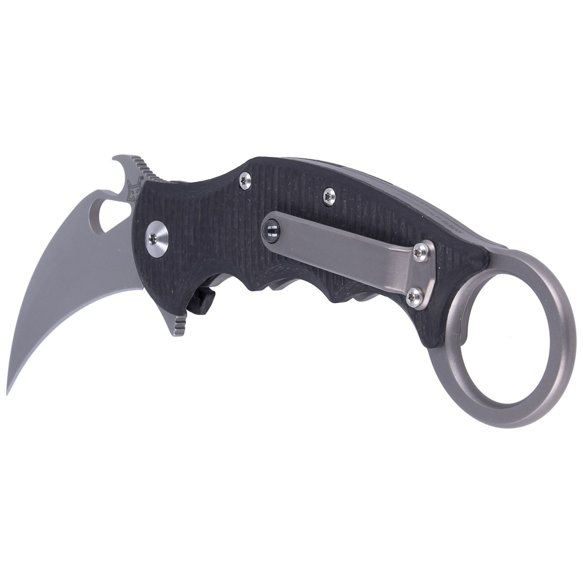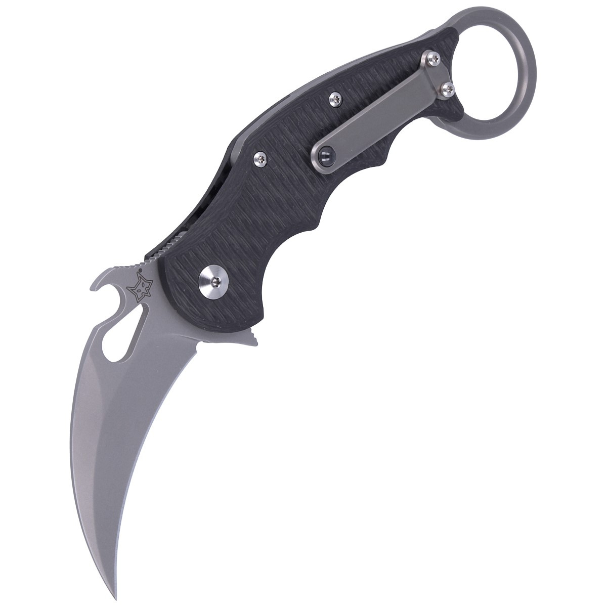 - Karambit Titanium / Carbon Fiber, Bead Blasted ELMAX folder firmy FOX ukazuje jak bardzo ewoluowały pochodzące z Azji tradycyjne noże karambit. Ostrze Hawkbill ze stali ELMAX,, trzy systemy szybkiego otwarcia klingi hak Emerson, flipper i owalne wycięcie