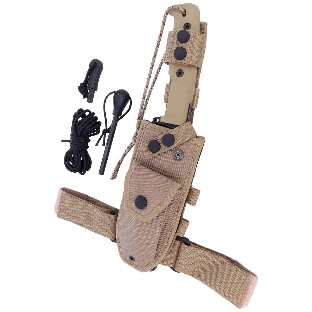 Pochwa - udowa z odpornej na przetarcia, wodoodpornej cordury w piaskowym kolorze z możliwością mocowanie pod taśmy systemu M.O.L.L.E. (Modular Lightweight Load-carrying Equipment). Kabura umożliwia przenoszenie noża na pasie lub na kamizelce zgodnej z systemem MOLLE. Dolna część pochwy z zapinaną na rzep Velcro taśmą, umożliwiającą mocowanie do uda. Z boku pochwy mocowanie na krzesiwo (w komplecie), w pouchu paracord i łatwopalny materiał do rozpalania ogniska krzesiwem.
