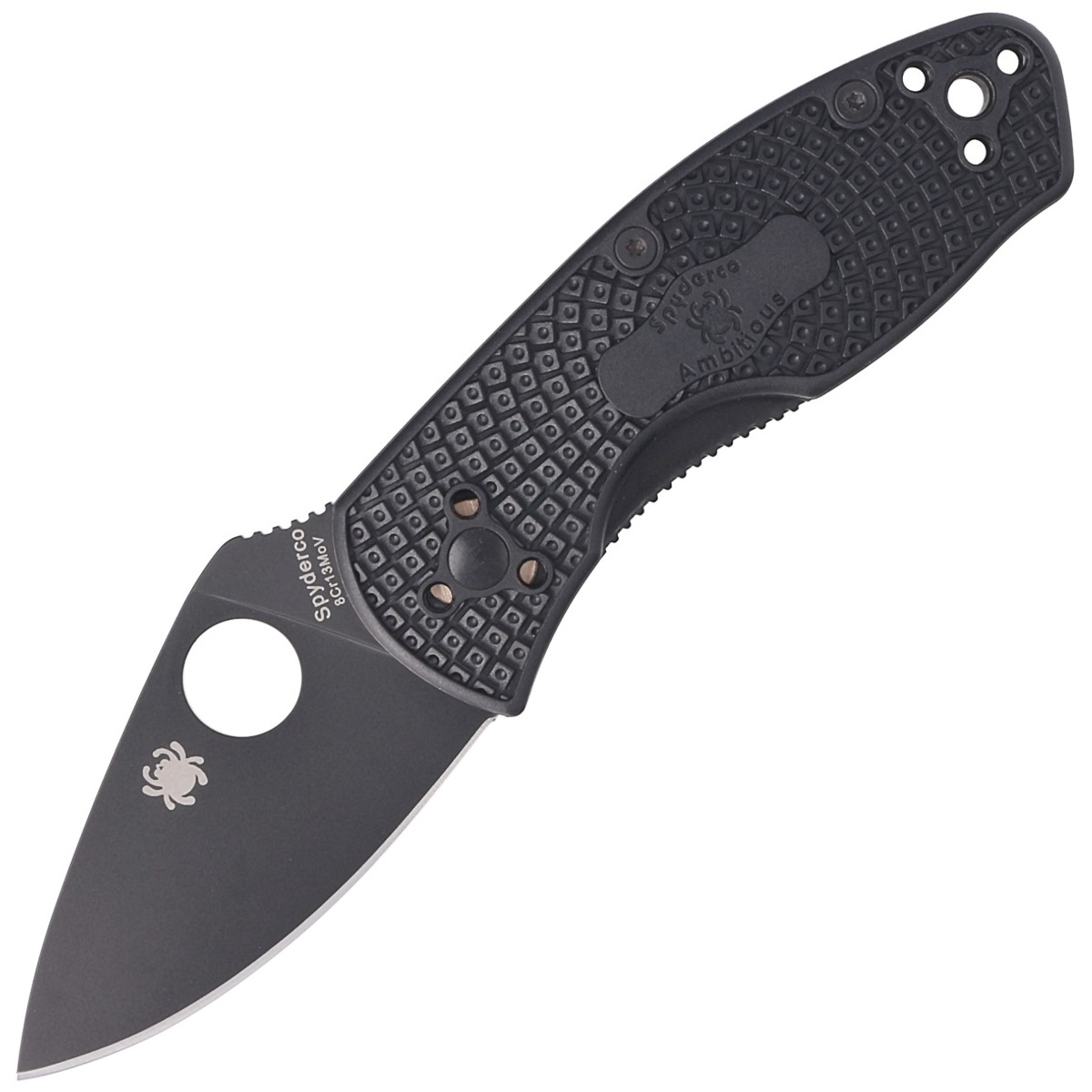 Głownia - o szerokim zakrzywionym profilu Leaf Shaped (kształt liścia), grubości 3.1 mm zapewnia doskonałą geometrię krawędzi tnącej przy niskim tarciu. Krawędź tnącą wyprowadzono szlifem pełnym płaskim (Full Flat Grind). Ostrze gładkie Plain rozciąga się na całej długości klingi, umożliwiając potężne cięcia. Klinga wykonana z dobrze trzymającej ostrość stali nierdzewnej 8Cr13MoV (odpowiednik japońskiej stali AUS-8) pokrytej czarną, antyodblaskową powłoką. Staranne umieszczenie na głowni powiększonego 14 mm okrągłego wycięcia SpyderHole (patent Spyderco) ustawia dłoń do intuicyjnego otwarcia głowni oraz jednocześnie zwiększa garb podparcia pod kciuk spine jimping. Blokowana blokadą głowni Liner-Lock, Michaela Walkera z jimped linerem.