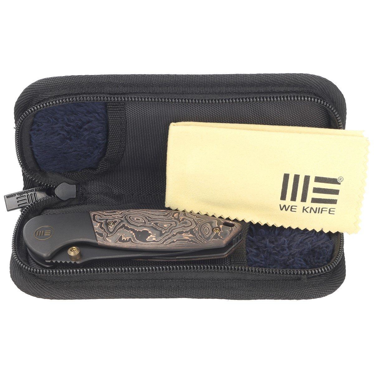 Rękojeść - bolstery z tytanu 6AL4V, rękojeść z Copper Foil Carbon Fiber, włókna węglowego z miedzianymi akcentami. Fazowane krawędzie okładek eliminują ostre krawędzie. Okładziny przykręcono do misternie obrobionego tytanowego backspacera, dając pewność wieloletniego użytkowania. Oś pivota zdobi stylizowane logo marki WE Knife. Jednopozycyjny (prawa) tytanowy klips deep carry pozwala przenosić dyskretnie nóż w kieszeni w pozycji tip-up (czubkiem ostrza do góry).