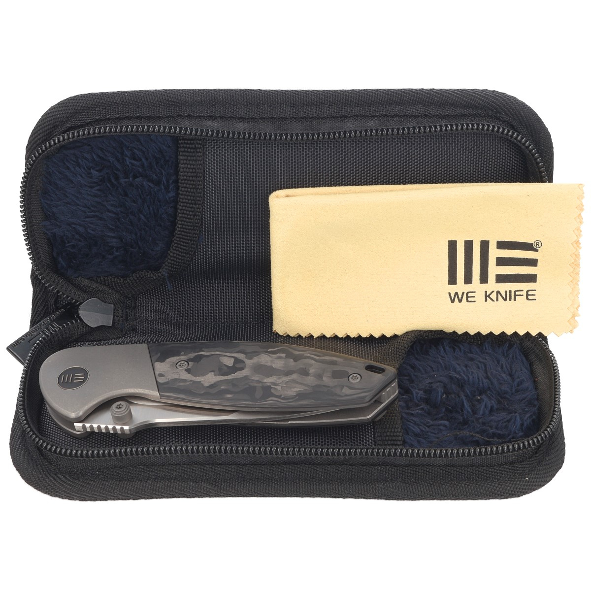 Rękojeść - bolstery z tytanu 6AL4V, rękojeść z Marble Carbon Fiber, włókna węglowego o strukturze marmuru. Fazowane krawędzie okładek eliminują ostre krawędzie. Okładziny przykręcono do misternie obrobionego tytanowego backspacera, dając pewność wieloletniego użytkowania. Oś pivota zdobi stylizowane logo marki WE Knife. Jednopozycyjny (prawa) tytanowy klips deep carry pozwala przenosić dyskretnie nóż w kieszeni w pozycji tip-up (czubkiem ostrza do góry).