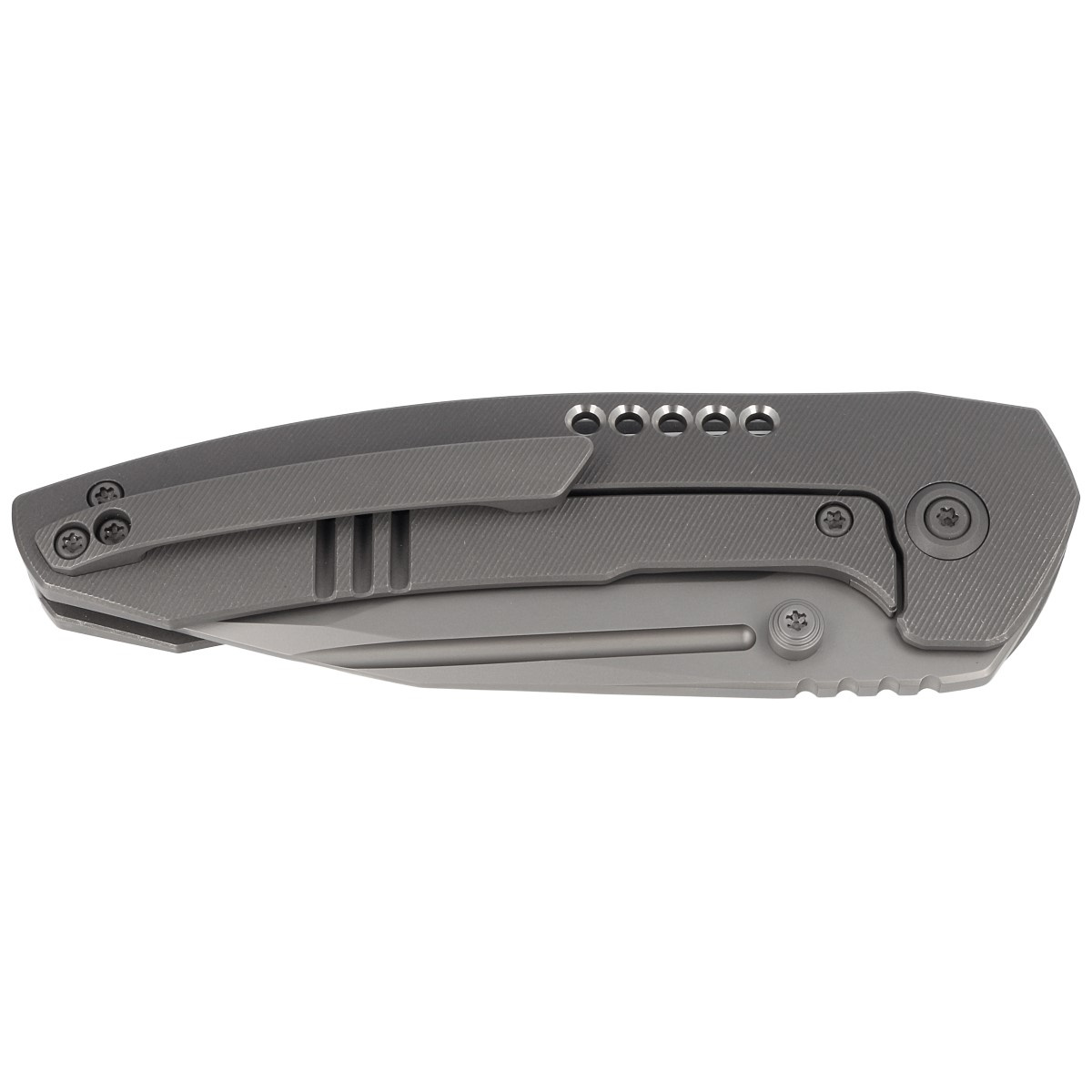 Rękojeść - grube kawałki tytanu, połączone ze sobą przy pomocy tytanowego backspacera. Tekstura powierzchni wykonana na obrabiarkach CNC polepsza pewnoć uchwytu. Prostota i solidność konstrukcji dają pewność wieloletniego użytkowania. Klips jednopozycyjny (prawa), wykonany z tytanu, umożliwia przenoszenie noża w pozycji tip-up. W tylnej części backspacera znajduje się miejsce do przewleczenia linki zabezpieczającej lub ozdobnej. Podobnie jak w innych modelach, oś pivota ozdobiona jest stylizowanym logiem producenta.