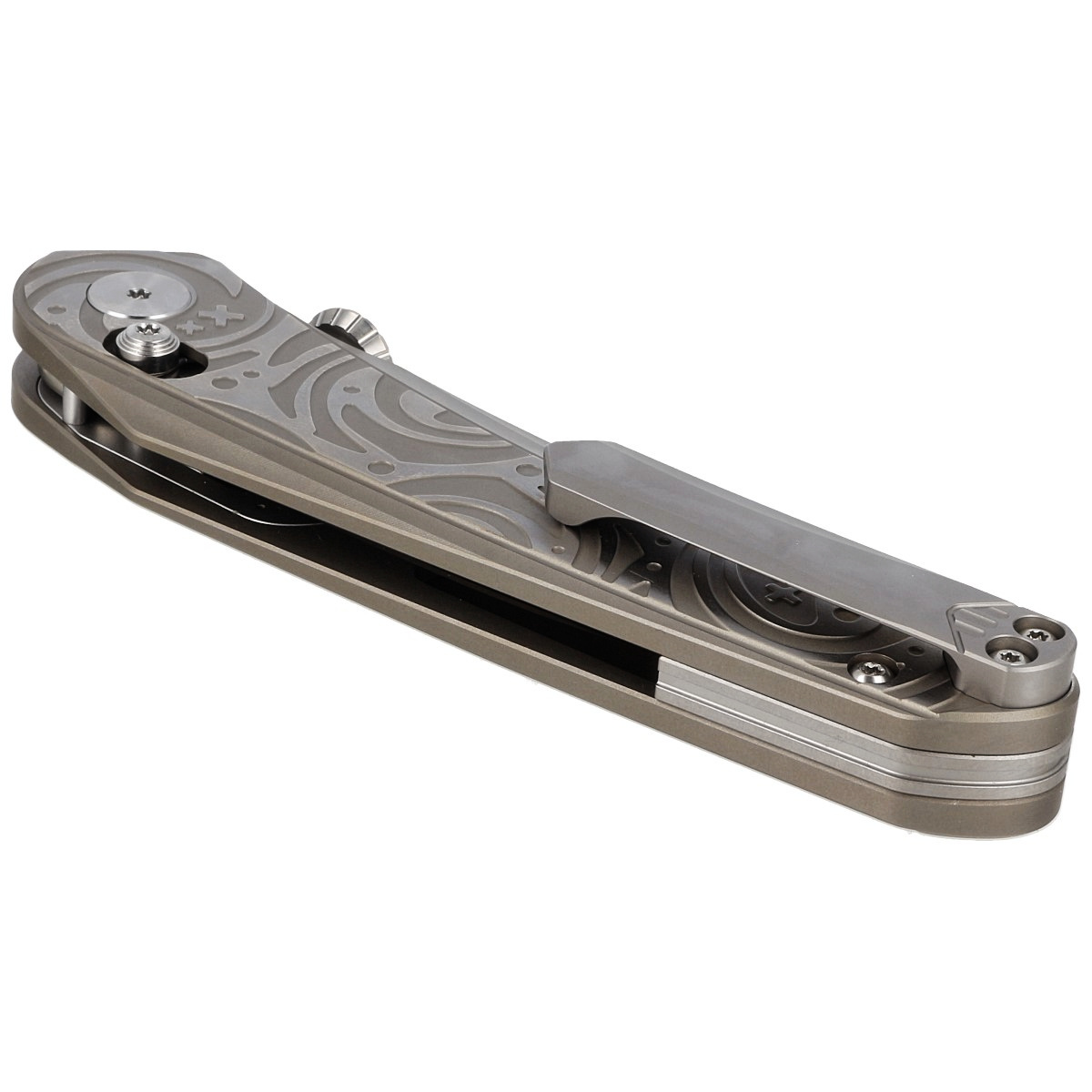Rękojeść - to dwa kawałki litego tytanu 6AL4V. Fazowane krawędzie okładek eliminują ostre ranty dla wygody i poprawiają pewność uchwytu, dodatkowe zdobienie w postaci wyfrezowanych motywów graficznych. Masywny backspacer do którego przymocowano okładziny gwarantuje sztywność i wytrzymałość całej konstrukcji. Dwupozycyjny, lewo/prawostronny tytanowy klips z motywem graficznym ćmy umożliwia przenoszenie noża w pozycji tip-up, czubkiem ostrza ku górze.