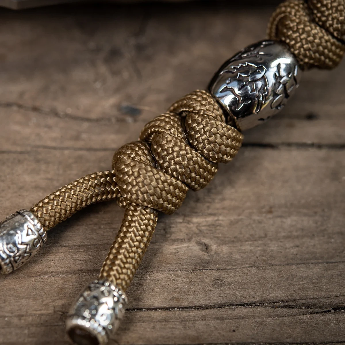 M-Tac Zeus Stainless Steel Coyote, przywieszka do noża, latarki, breloka, wykonana z paracordu, zakończona metalowym koralikiem z greckim wzorem. Oprócz walorów estetycznych, przedłuża rękojeść noża ułatwiając wyciągnięcie go z kieszeni. Znakomicie również się sprawdza jako przedłużenie zamka w kurtce pozwalając na wygodne używanie zamka nawet w grubych rękawicach.