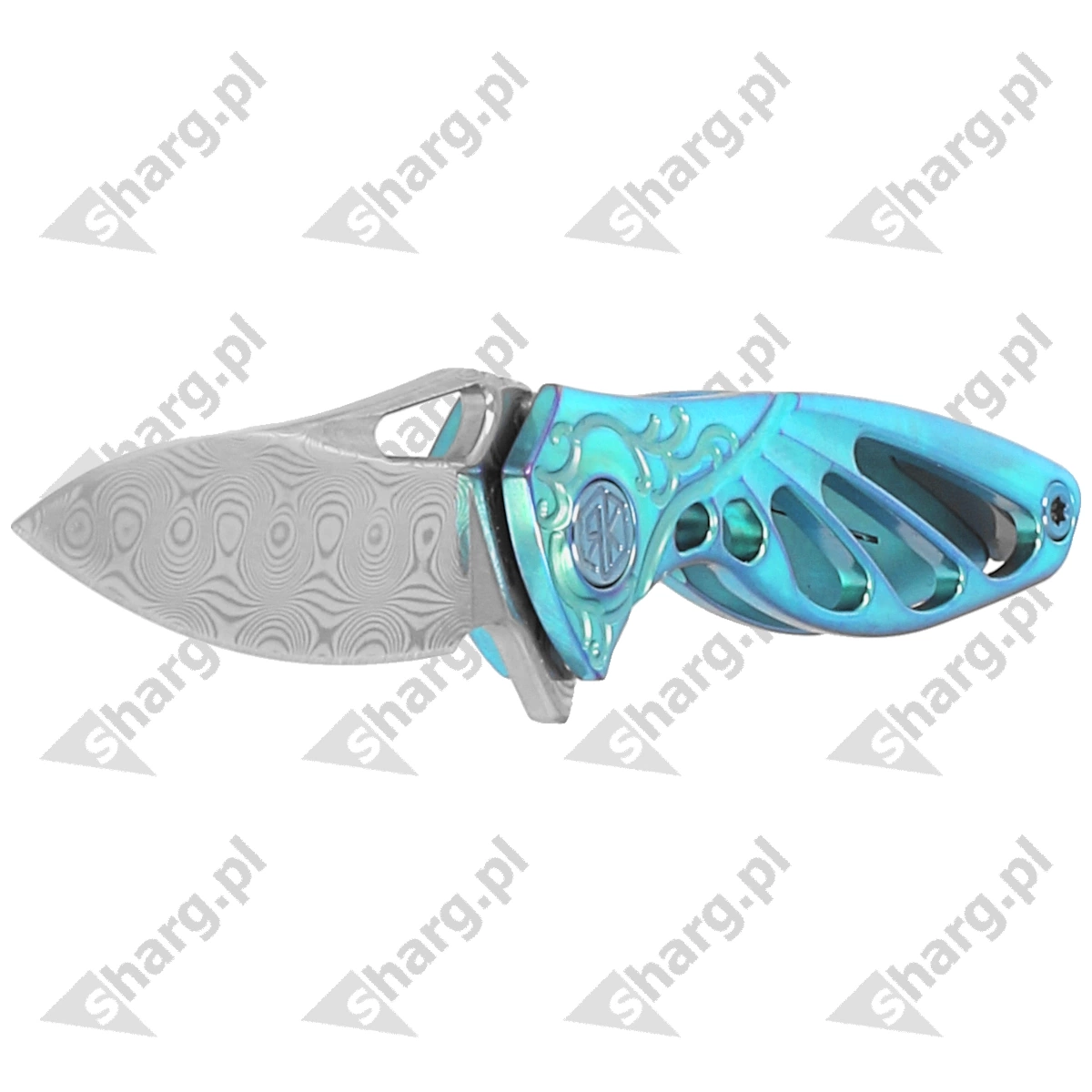 - Hummingbird Green Titanium, Rose Damascus, najwyższej jakości nieduży nóż składany EDC. Głownia z damastu o niepowtarzalnym wzorze. Otwierany szybką płetwą Flippera, okładziny z tytanu, ceramiczne łożyska, pochwa do zawieszania na szyi!