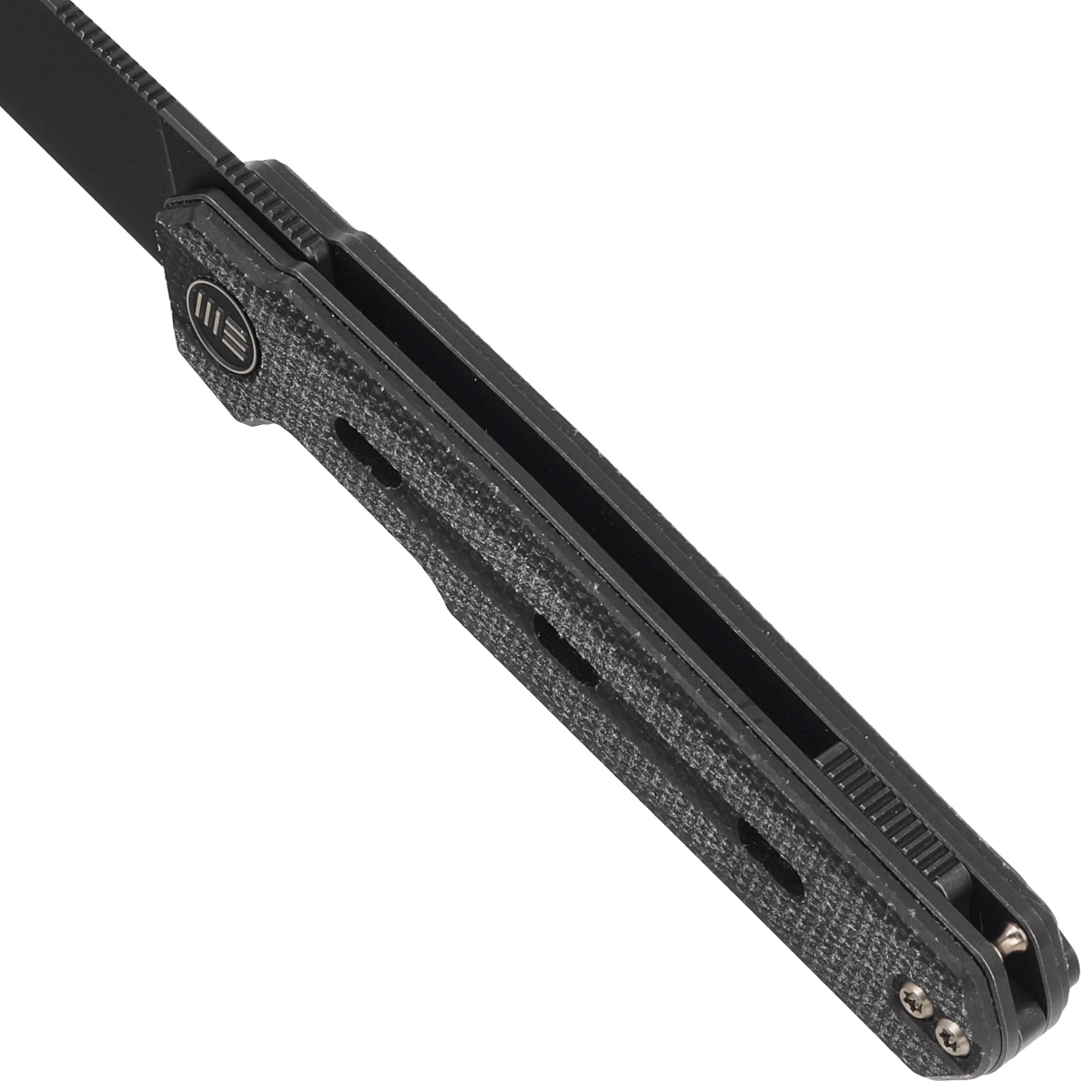 Rękojeść - okładziny z Canvas Micarty (płótno prasowane pod ciśnieniem z żywicą syntetyczną) mocowane do linersów z tytanu 6AL4V. Fazowane krawędzie okładek eliminują ostre krawędzie. Okładziny przykręcono do misternie obrobionego tytanowego backspacera, dając pewność wieloletniego użytkowania. Oś pivota zdobi stylizowane logo marki WE Knife. Dwupozycyjny (prawa/lewa) tytanowy klips deep carry pozwala przenosić dyskretnie nóż w kieszeni w pozycji tip-up (czubkiem ostrza do góry). Z tyłu rękojeści lanyard hole, ukryte w backspacerze miejsce na linkę ozdobną lub zabezpieczającą.