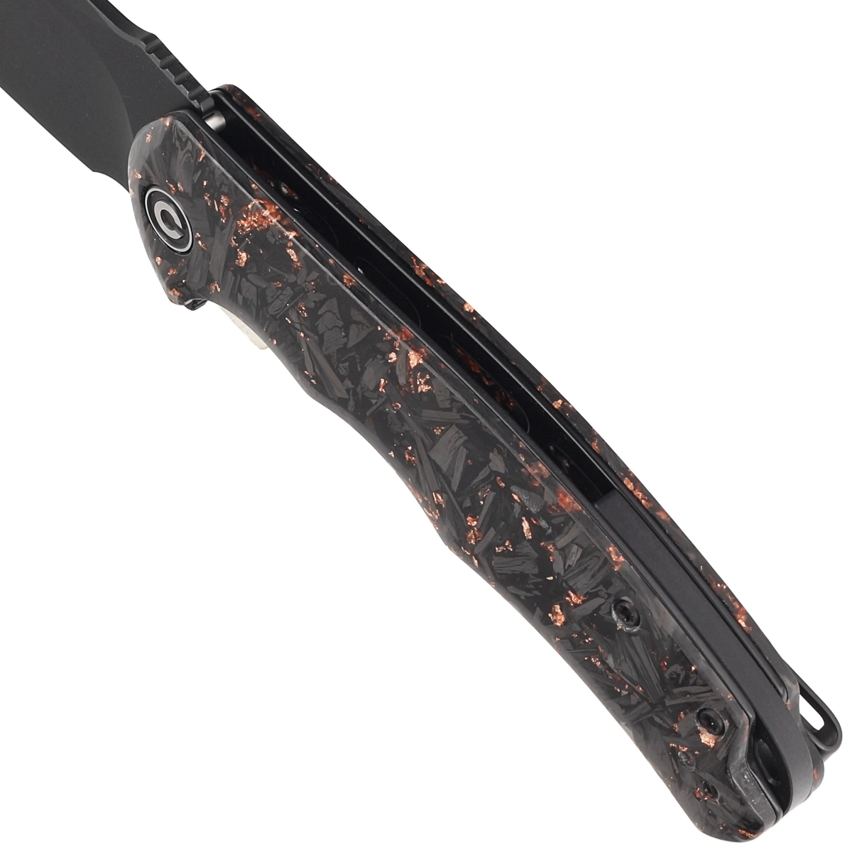 Rękojeść - okładziny o niepowtarzalnym wzorze 3D. Wykonane z kawałków rozdrobnionego włókna węglowego (Carbon Fiber) i płatków miedzi zatopionych w przezroczystej żywicy. Całość przykręcono do stalowej ramy noża. Fazowane krawędzie okładek eliminują ostre krawędzie, a wykonane z przodu podcięcia na palce (fore finger groove) poprawiają pewność uchwytu. W praktyce oznacza to wiele lat użytkowania bez osłabienia konstrukcji. Dwupozycyjny klips typu deep carry dla prawo i leworęcznych umożliwia przenoszenie noża w pozycji tip-up (czubkiem ostrza do góry). Nad klipsem lanyard hole, powiększony otwór na linkę zabezpieczającą.