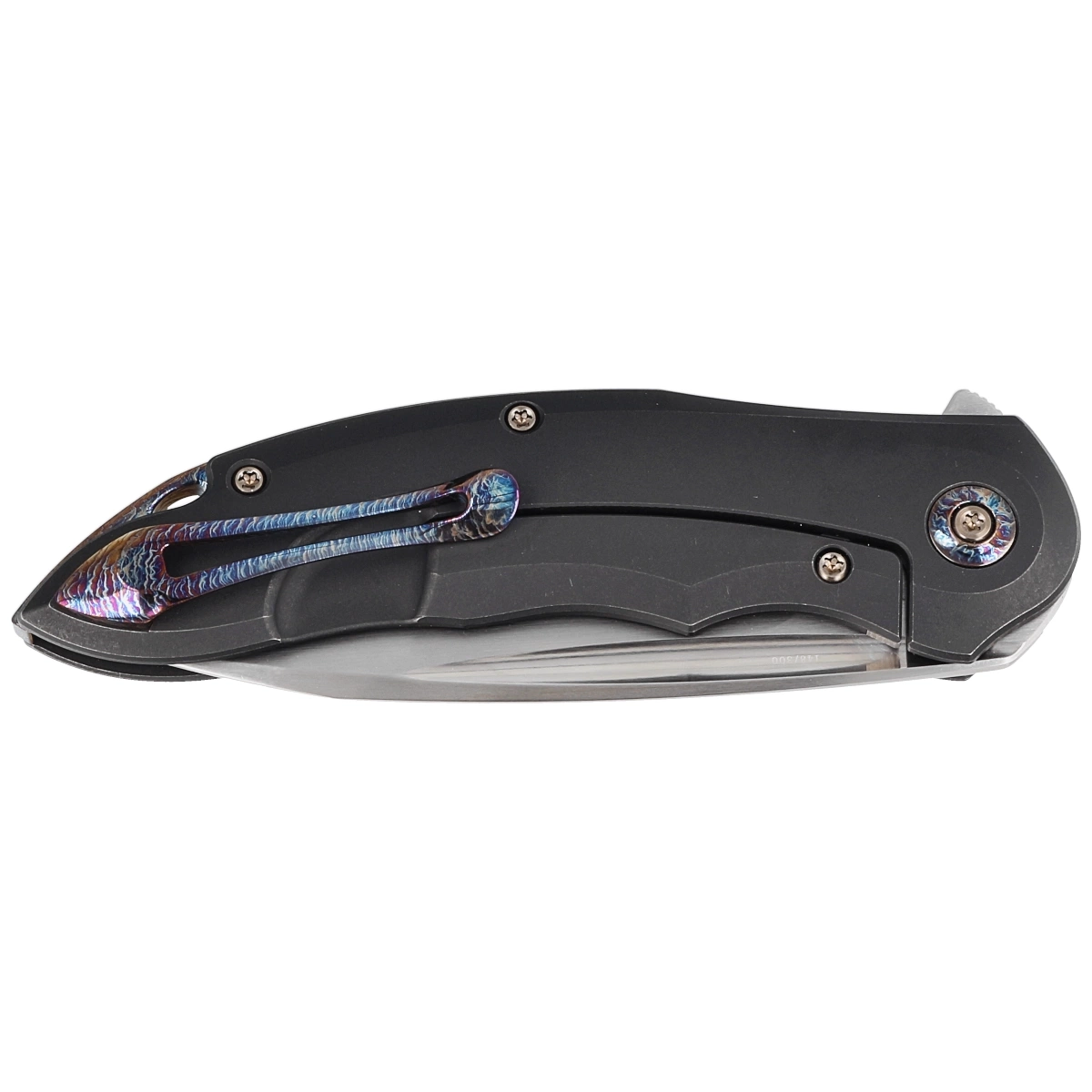 Makani LE No 148/300 Black Titanium / Flamed Titanium Inlay, Hand Rubbed Satin. (Limited Edition). Limitowana edycja ograniczona do 300 szt, folder o numerze 148. Efektowny i mocny nóż składany projektu Antona Tkachenki z ręcznie polerowaną satynową klingą ze stali premium CPM 20CV. Rękojeść z anodyzowanego na czarno tytanu z tytanowymi wkładkami i tytanowym klipsem. Absolutny "must have"!