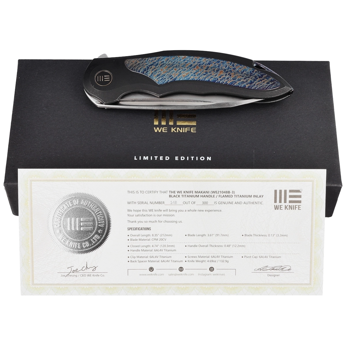 - Makani LE No 148/300 Black Titanium / Flamed Titanium Inlay, Hand Rubbed Satin. Limitowana edycja ograniczona do 300 szt, o numerze 148. Duży i mocny nóż składany projektu Antona Tkachenki, doskonały w roli uniwersalnego EDC. "Must have"!