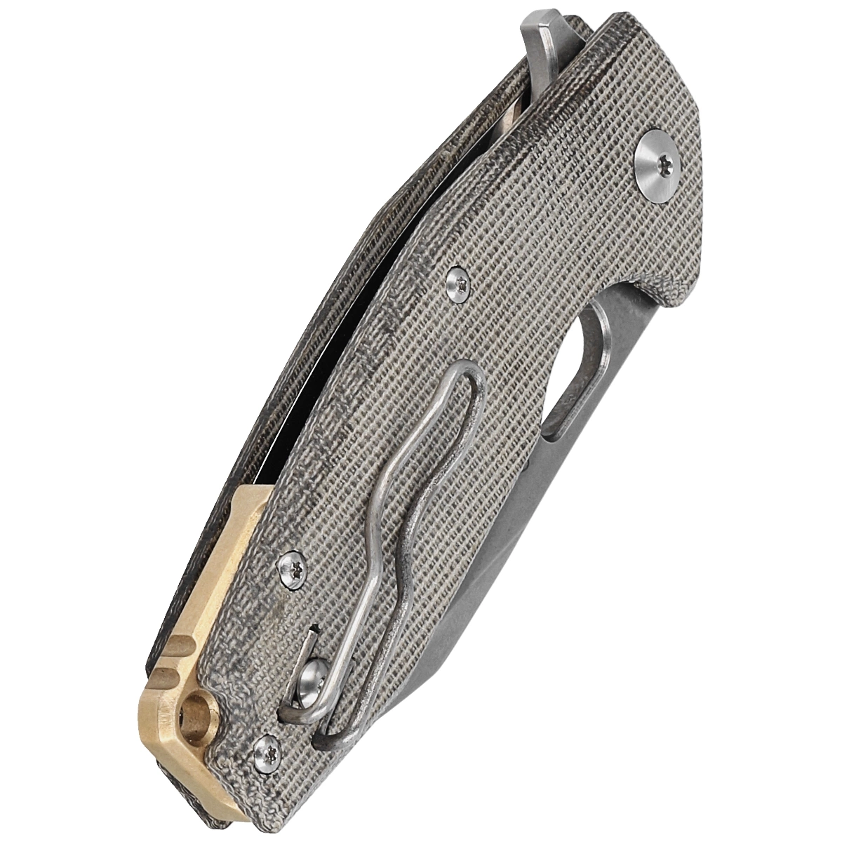 Rękojeść - okładziny z Micarty (płótno prasowane pod ciśnieniem z żywicą syntetyczną) niewrażliwe na warunki atmosferyczne, odporne na uszkodzenia mechaniczne. Fazowane krawędzie okładek eliminują ostre krawędzie dla wygody chwytu. Oksydowany na kolor szary backspacer zapewnia sztywność i solidność całej konstrukcji. Dwupozycyjny (prawa/lewa) lekki klips z drutu (wire clip) umożliwia przenoszenie noża w pozycji tip-up, czubkiem ostrza ku górze. Nad klipsem otwór do przewleczenia linki zabezpieczającej lub ozdobnej.