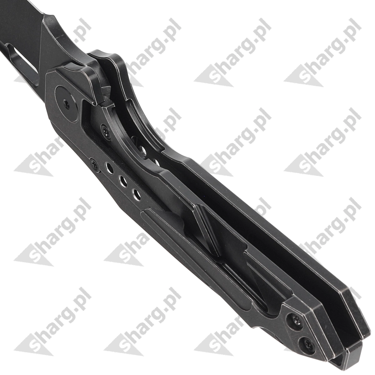 Głownia - szeroka, typu Reverse Tanto z maskującym rysy wykończeniem Stonewashed, pokrytym nastepnie czarną powłoką. Łagodna krzywizna krawędzi tnącej zbiega się w kierunku ostrego jak igła czubka noża. Grubość klingi zapewnia wysoką wytrzymałość podczas gdy wysoki, płaski szlif daje doskonałą geometrię krawędzi tnącej oraz ekstremalną wydajność cięcia. Dodatkowym wzmocnieniem jest długie zbrocze. Ceramiczne łożyska kulkowe wspomagają otwarcie ostrza za pomocą szybkiej płetwy front flippera (index-finger front flipper). Nóź możemy również otworzyć przy użyciu otworu w klindze (thumb hole). Całość blokowana jest sprawdzoną i popularną blokadą frame lock ze stalową wkładką zabezpieczającą przed wycieraniem czoła blokady.