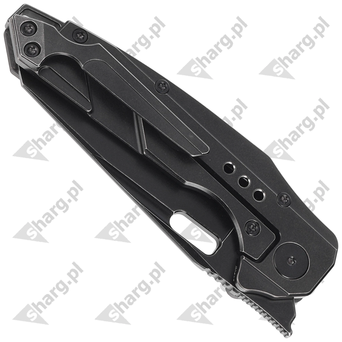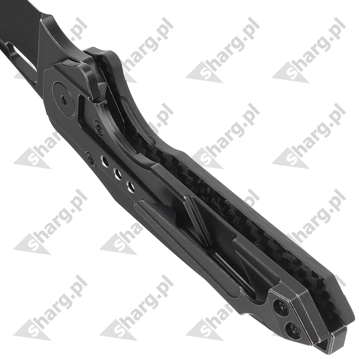 Głownia - szeroka, typu Reverse Tanto z maskującym rysy wykończeniem Stonewashed, pokrytym nastepnie czarną powłoką. Łagodna krzywizna krawędzi tnącej zbiega się w kierunku ostrego jak igła czubka noża. Grubość klingi zapewnia wysoką wytrzymałość podczas gdy wysoki, płaski szlif daje doskonałą geometrię krawędzi tnącej oraz ekstremalną wydajność cięcia. Dodatkowym wzmocnieniem jest długie zbrocze. Ceramiczne łożyska kulkowe wspomagają otwarcie ostrza za pomocą szybkiej płetwy front flippera (index-finger front flipper). Nóź możemy również otworzyć przy użyciu otworu w klindze (thumb hole). Całość blokowana jest sprawdzoną i popularną blokadą frame lock ze stalową wkładką zabezpieczającą przed wycieraniem czoła blokady.